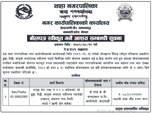 | 137 | Makawanpurgadhi Rural Municipality, Makawanpur | Aya Thekka (Overburden Stoke Materials) the auction contract for the overburden transferred from Shivam Cement 01/Aaya/MGRM-2082/083 | 25/11/2025 | PPMO | 26/12/2025 | Click Here | |
