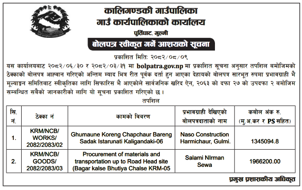 | 125 | Kaligandaki Rural Municipality,Gulmi | Procurement of Materials and Transportation up to road head Site (Kaligandaki -03) | 25/11/2025 | PPMO | 09/12/2025 | Click Here | |