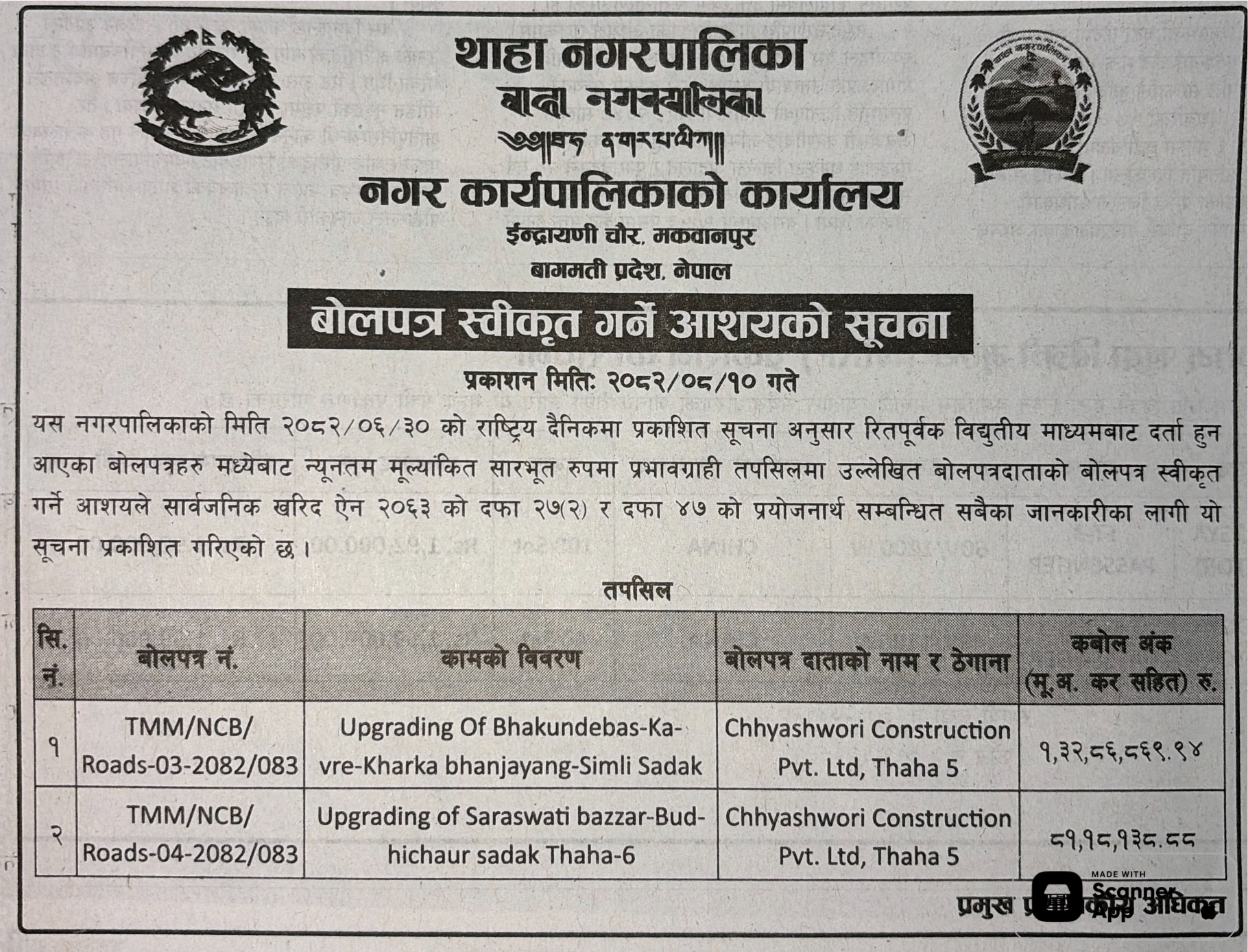 | 162 | Tokha Municipality, Office of the Municipal Executive | Wada bhari sadak kalopatre (Pot Hole Repair), Srijanshil tole sadak storonati and Guras tole Sadak Overley Ward -8 | 25/11/2025 | PPMO | 26/12/2025 | Click Here | |