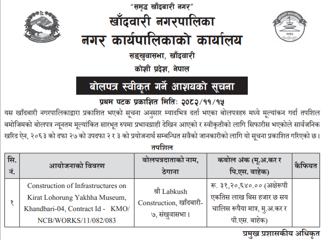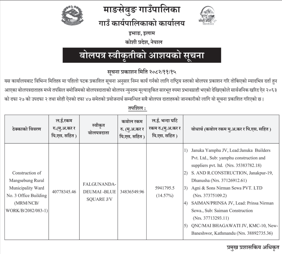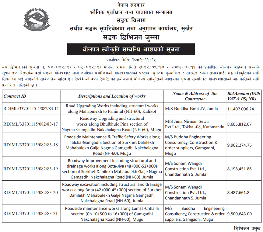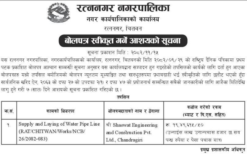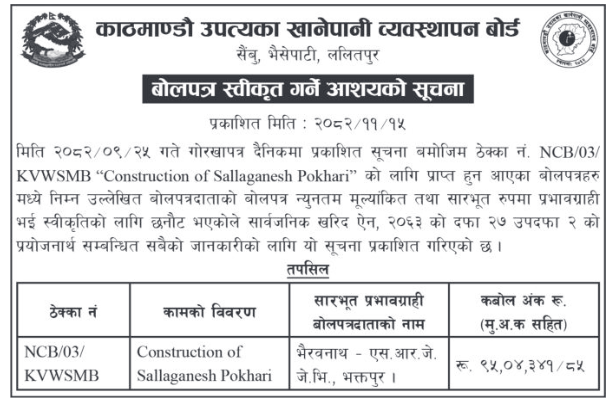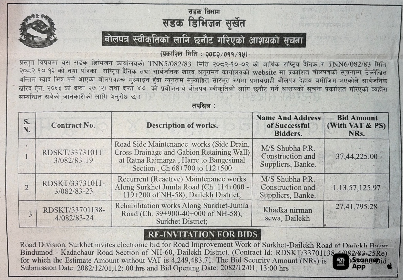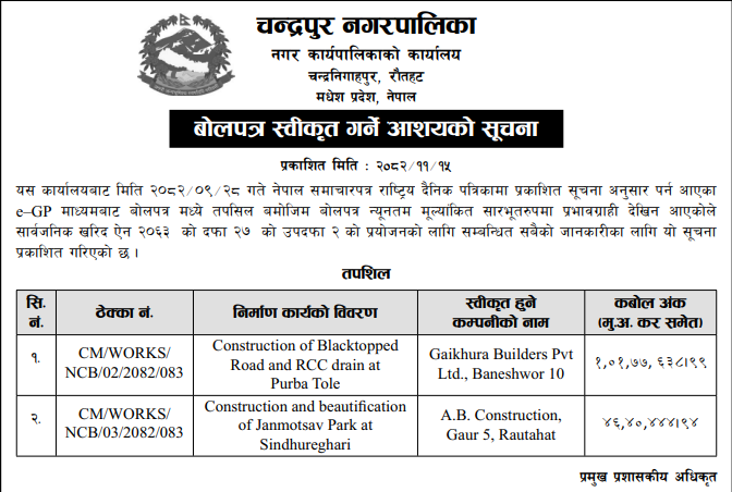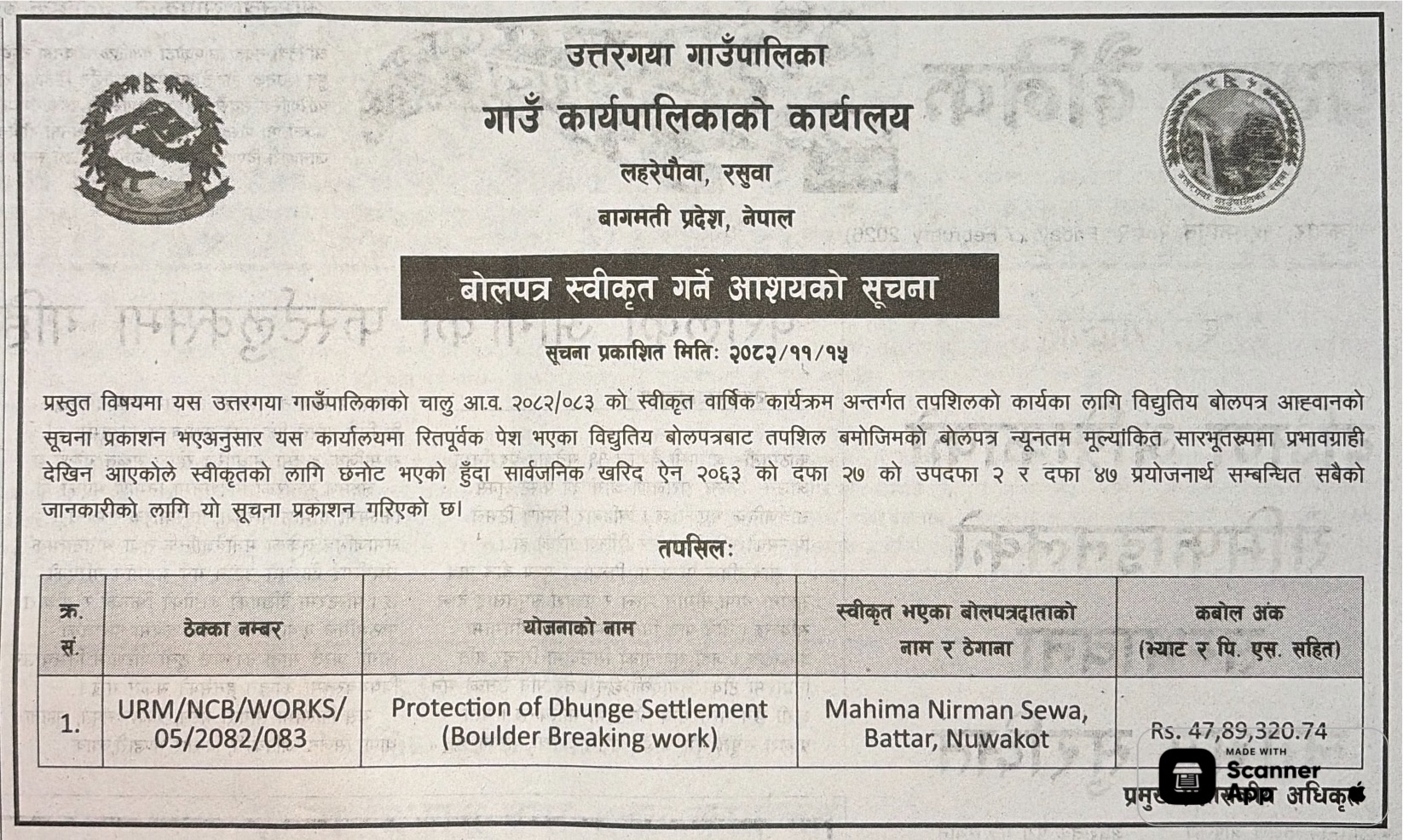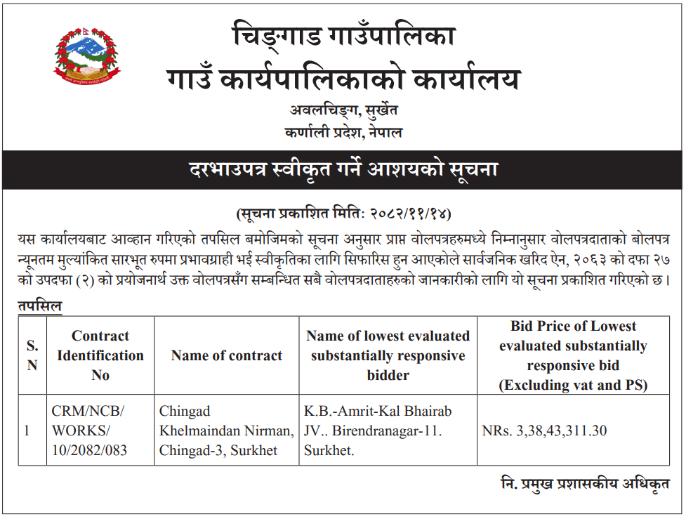 बोलपत्र स्विकृत ; Bid Award (Construction only) 27/02/2025 (Friday)