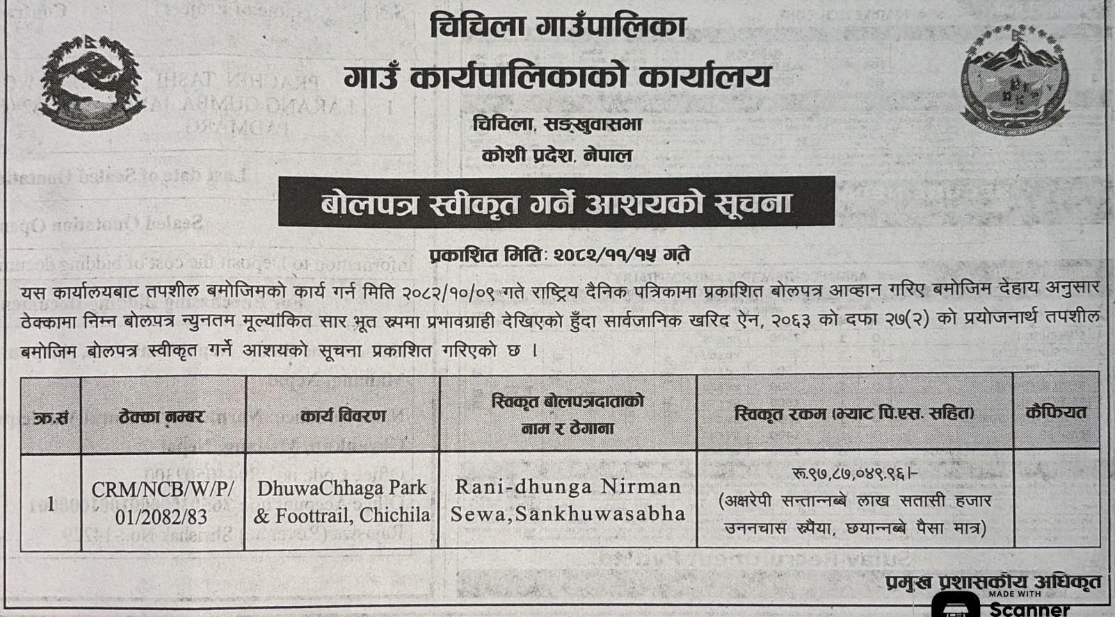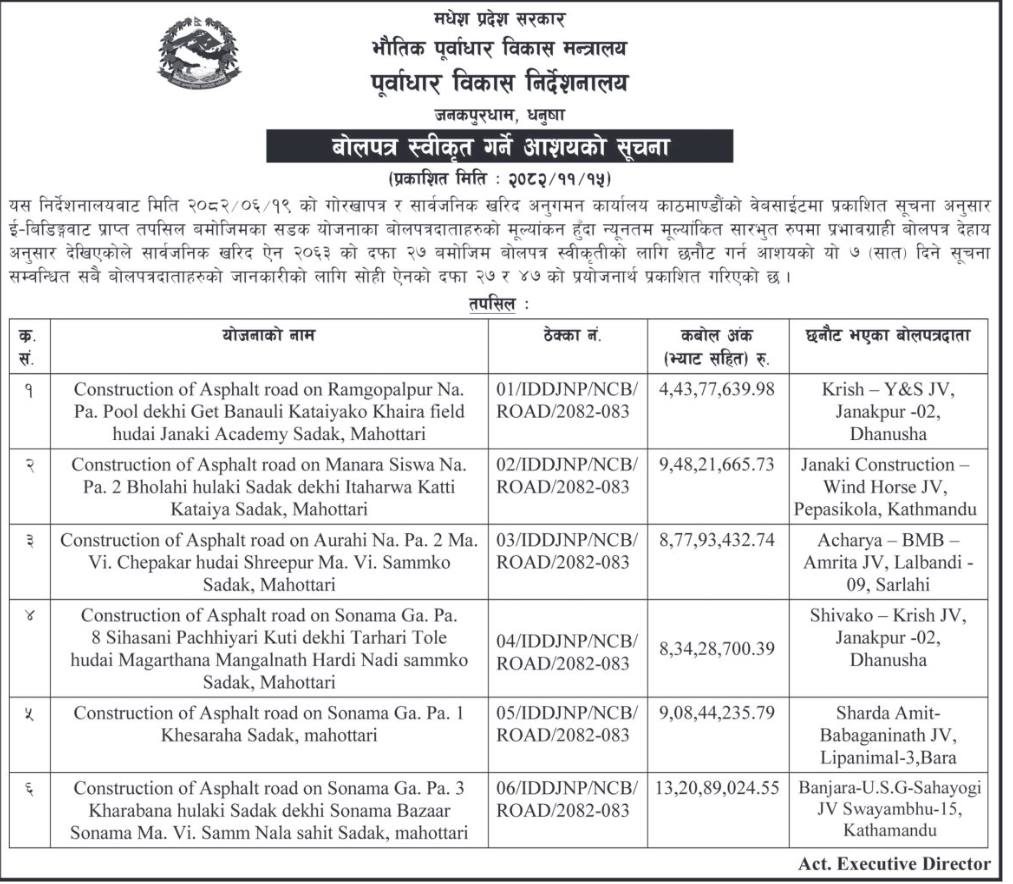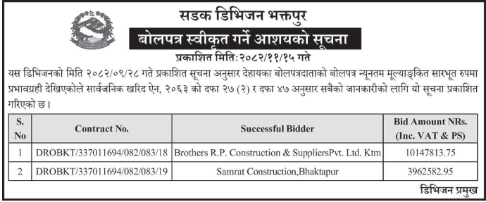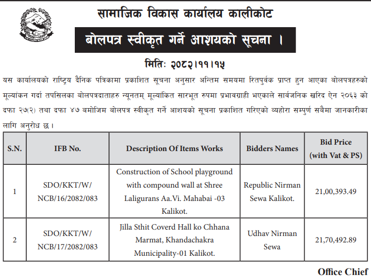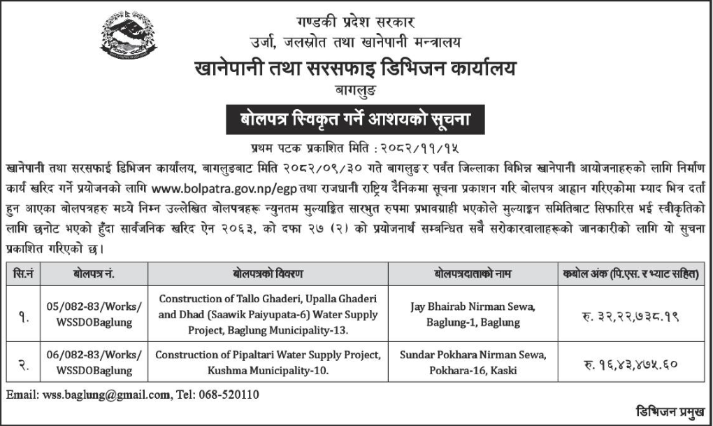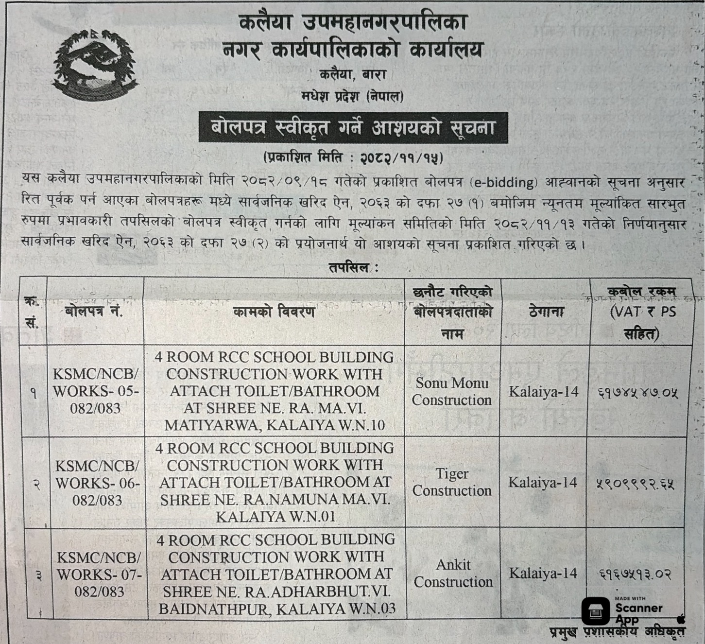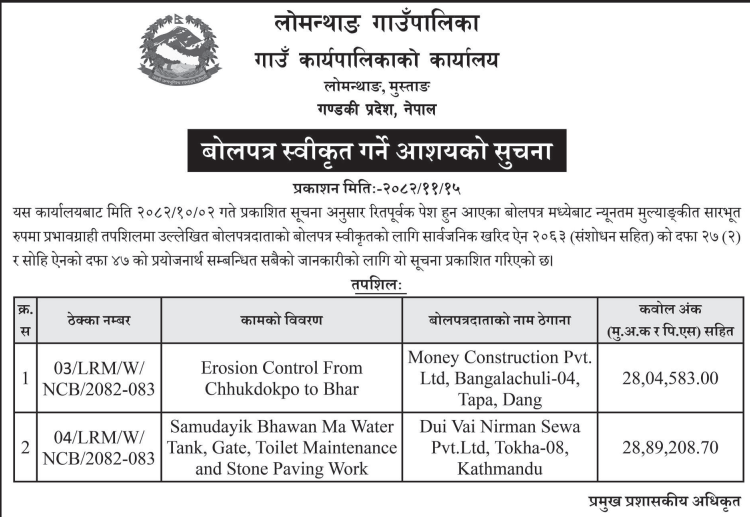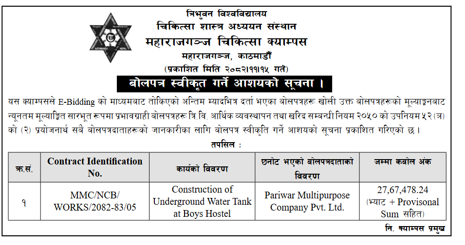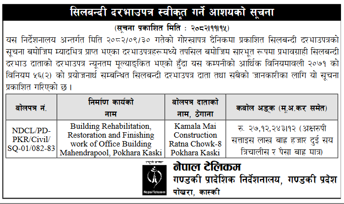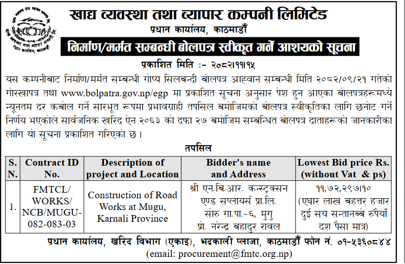 बोलपत्र स्विकृत ; Bid Award (Construction only) 27/02/2025 (Friday)