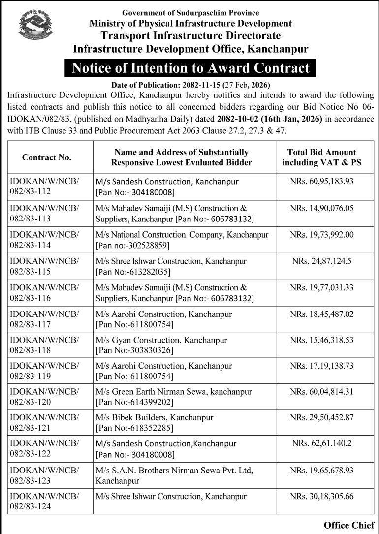 | 117 | Parshuram Municipality, Office of Municipal Executive | Baijanath Ma Vi Saleta Field Nirman Parshuram -11, Dadeldhura | 26/02/2026 | PPMO | 29/03/2026 | Click Here | |