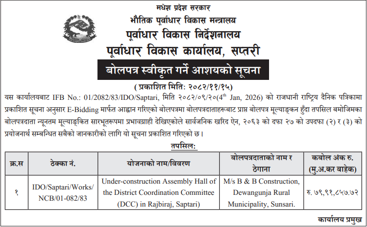 | 149 | Rautahat District Court, Gaur, Rautahat | Construction of building hall with truss structure on top floor of Rautahat District Court and Police Post of District Court. | 26/02/2026 | PPMO | 29/03/2026 | Click Here | |