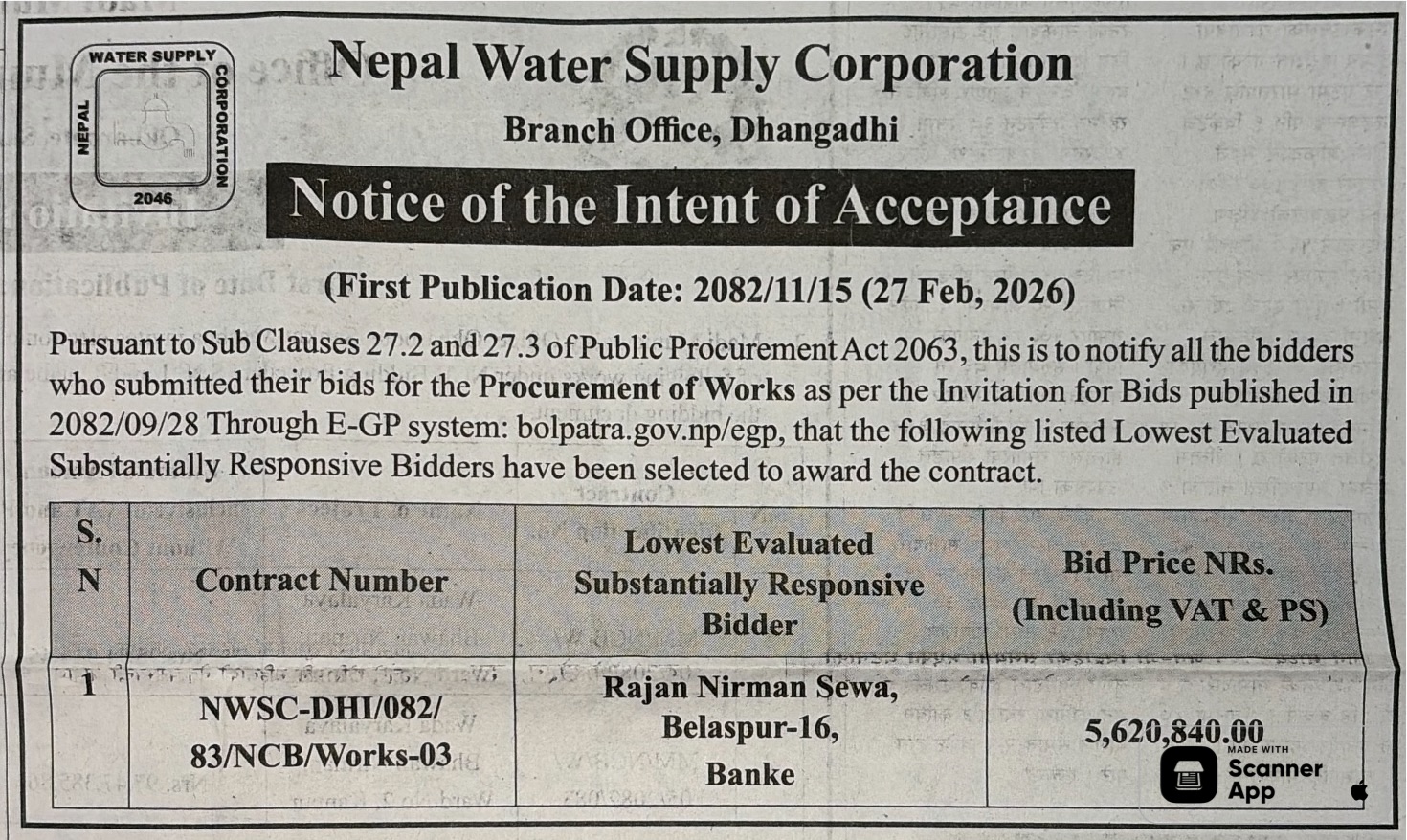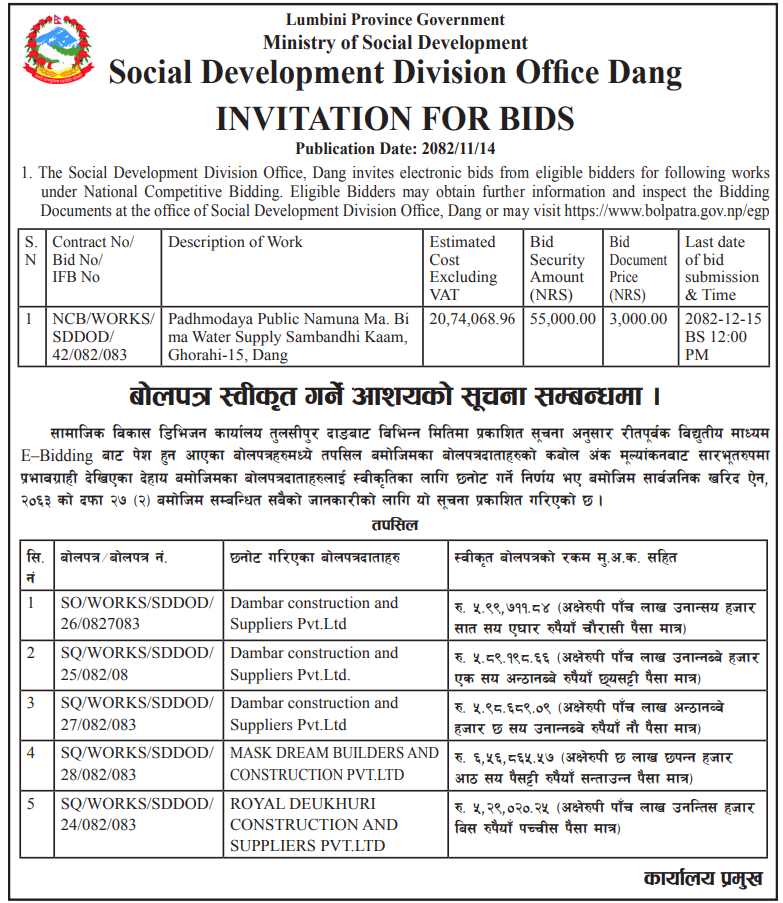 | 144 | Social Development Division Office,Dang | Padhmodaya Public Namuna Ma. Bi ma Water Supply Sambandhi Kaam, Ghorahi -15, Dang | 26/02/2026 | PPMO | 29/03/2026 | Click Here | |