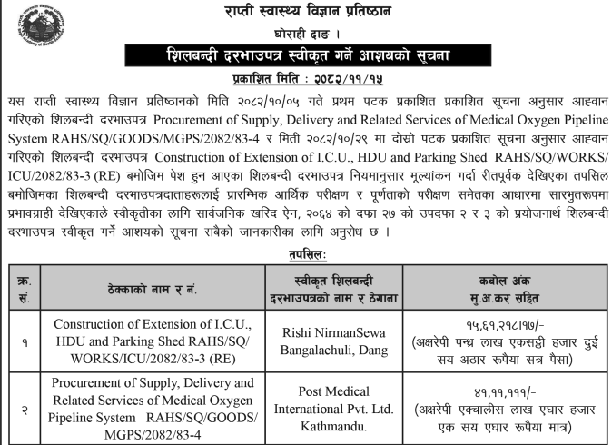 | 14 | Dullu Municipality Office, Karnali Province, DAILEKH; | Construction Of First Floor of Laundry Building and Truss Works on Isolation Building Of Dullu Hospital | 26/02/2026 | PPMO | 29/03/2026 | Click Here | |