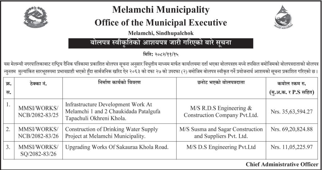 | 26 | Bhimphedi Rural Municipality | Construction of Chameli, Dharachur samudhyik Building Nirman | 26/02/2026 | PPMO | 13/03/2026 | Click Here | |