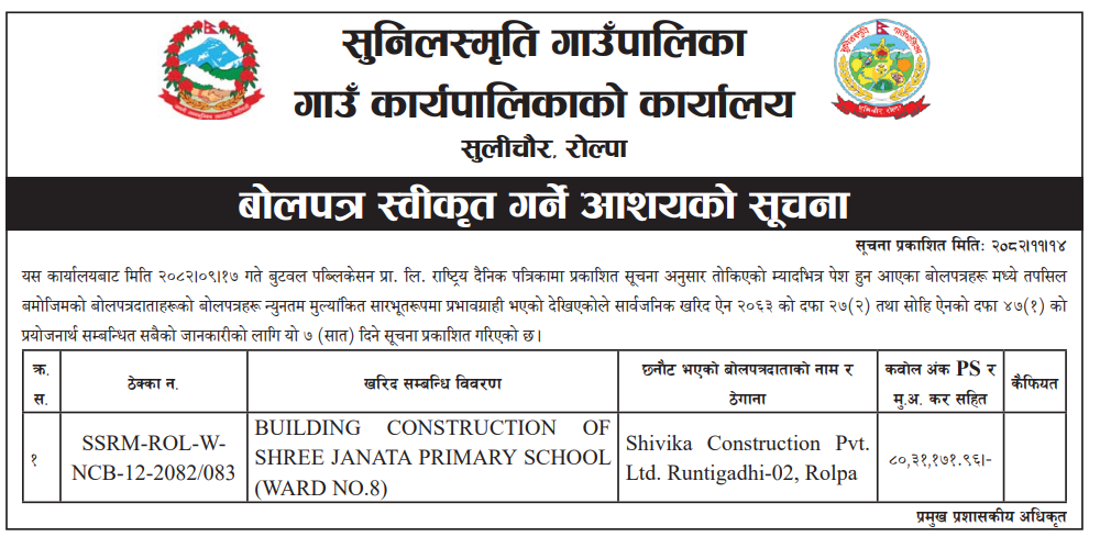 | 4 | Tribeni Rural Municipality Office, Lumbini Province, ROLPA; | Construction of 2 Storey 4 room RCC Building at Shree Araniko Ma.Vi School Nuwagaun TRM 02, Rolpa | 26/02/2026 | PPMO | 29/03/2026 | Click Here | |