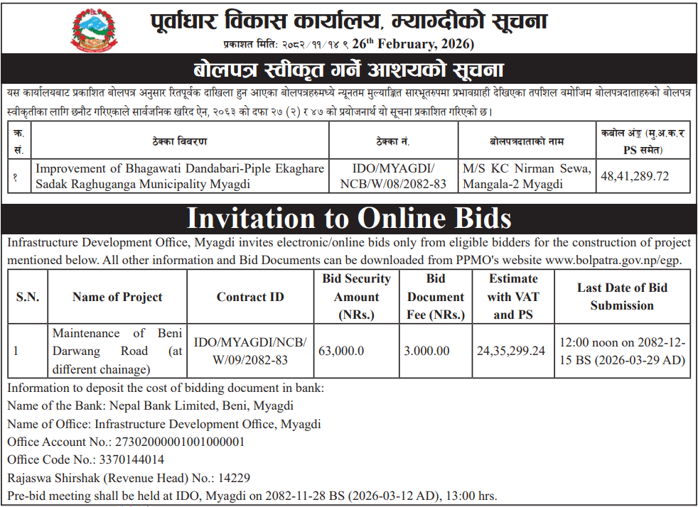 | 137 | Infrastructure Development Office, Myagdi | Maintenance of Beni Darbang Road (at different chainage) | 26/02/2026 | PPMO | 29/03/2026 | Click Here | |