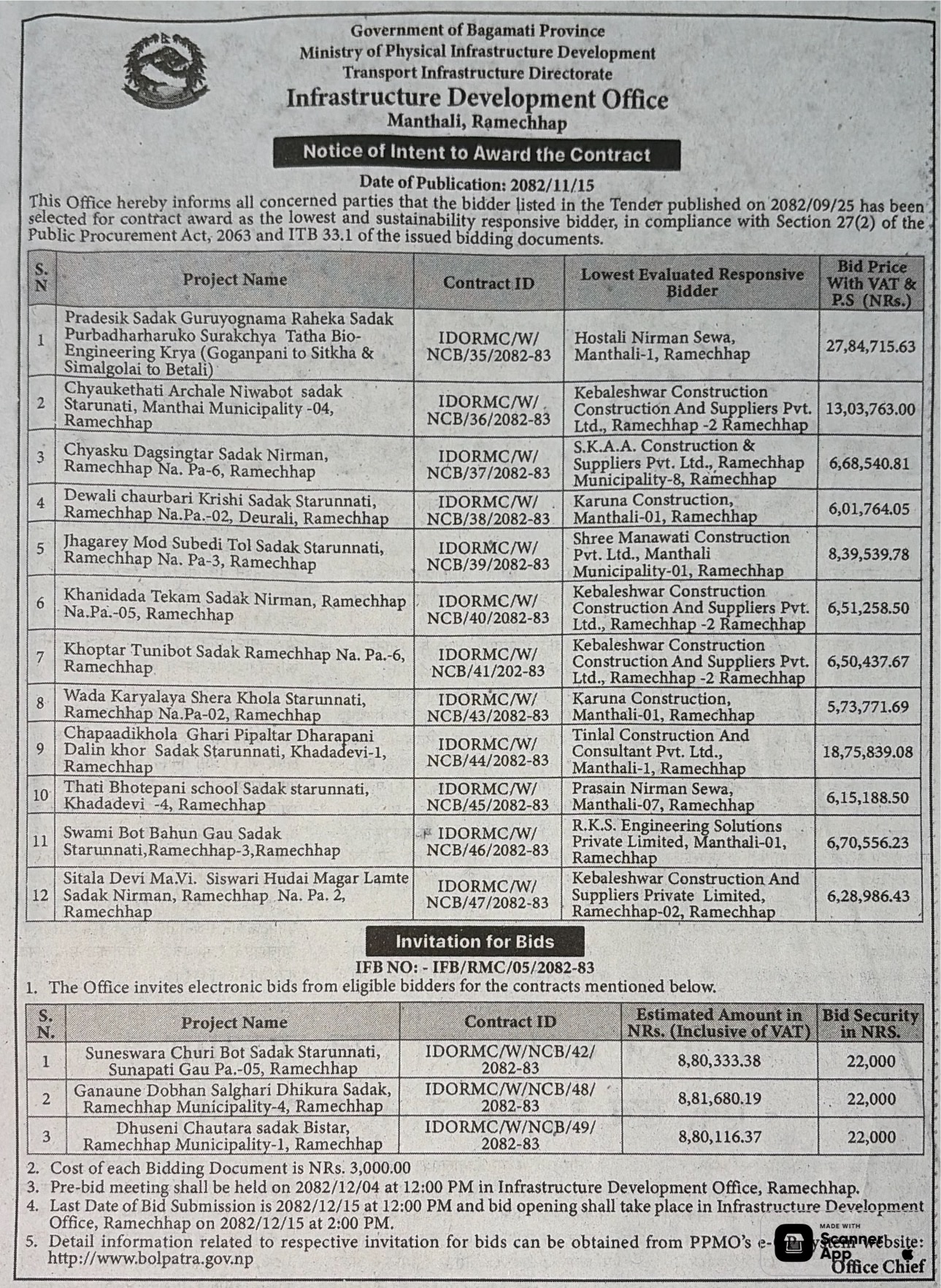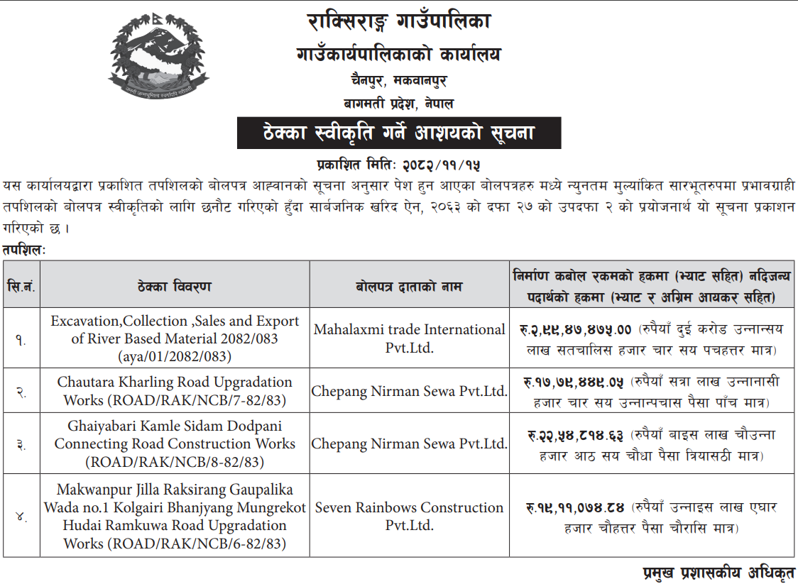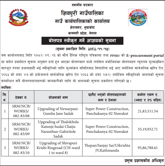 | 16 | Chulachuli Rural Municipality | Mining of Riverbed Material of OM SHANTI NAKA | 26/02/2026 | PPMO | 15/03/2026 | Click Here | |