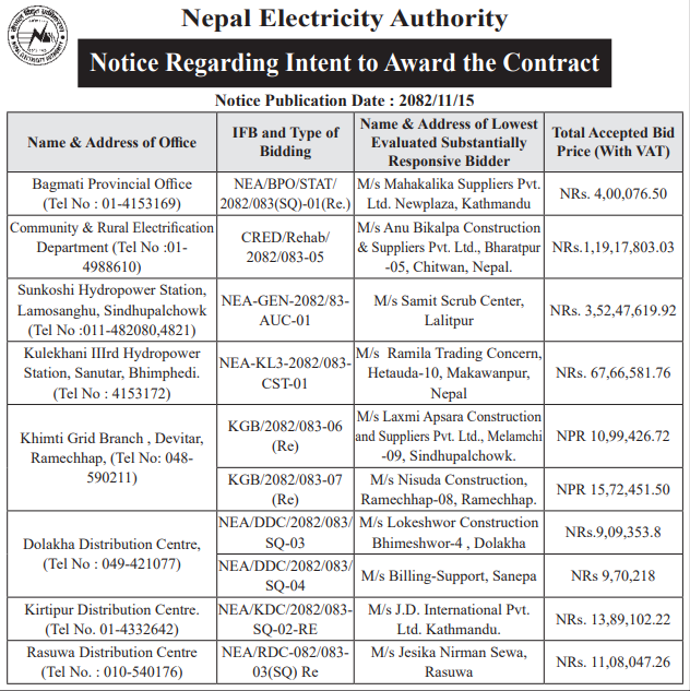 | 80 | NEA, Sunkoshi Hydropower Station | Supply, Delivery, Installation, Testing and Commissioning of Survelliance System at SHPS | 26/02/2026 | PPMO | 13/03/2026 | Click Here | |