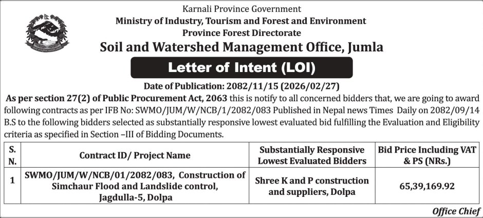 | 139 | Junichand Rural Municipality | LAMITARA BUDDI DADA JUMLA SADAK NIRMAN | 26/02/2026 | PPMO | 29/03/2026 | Click Here | |