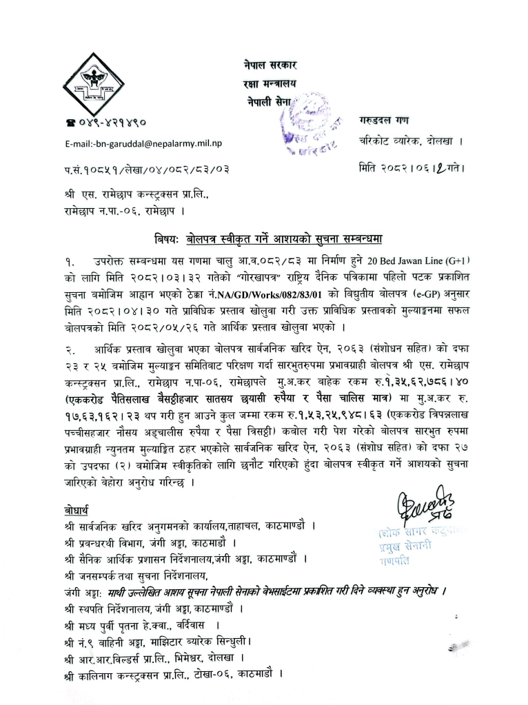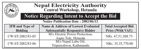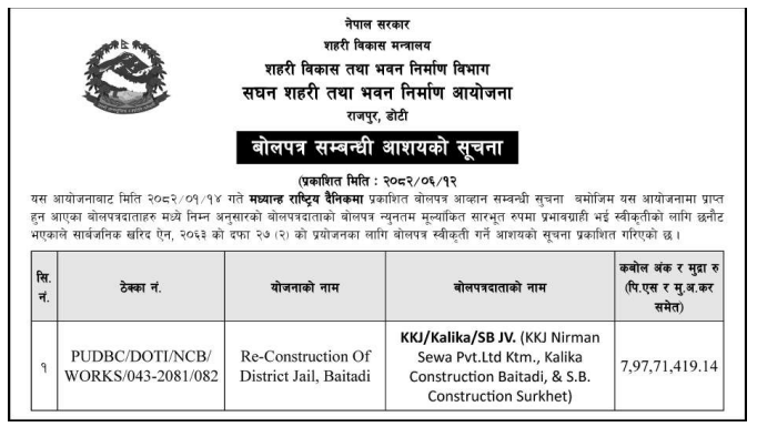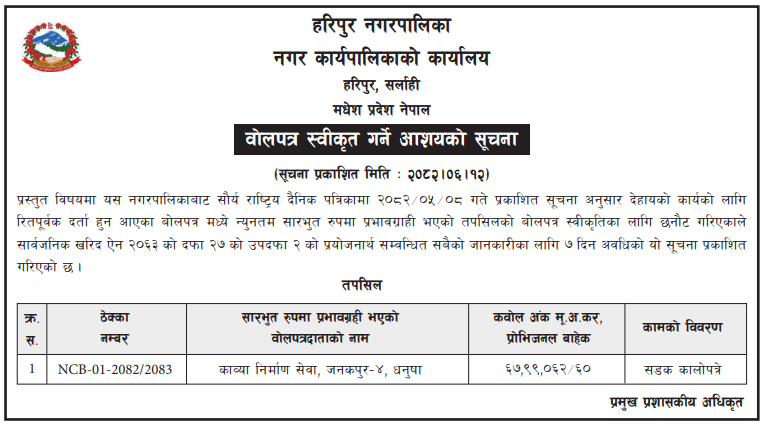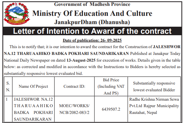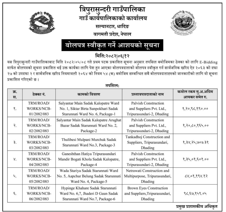 बोलपत्र स्विकृत ; Bid Award (Construction only) 27/09/2025 & 28/09/2025 (Saturday) & (Sunday)Tender टेन्डर Award