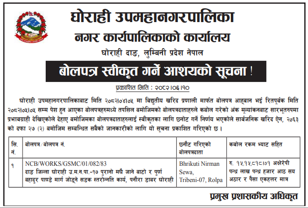 50 Aathabis Municipality, Rakamkarnali Dailekh Nagarpalika Ko Karyalaya Ma Sauchalaya Ra Khanepani Nirman. 26/09/2025 PPMO 12/10/2025 Click Here