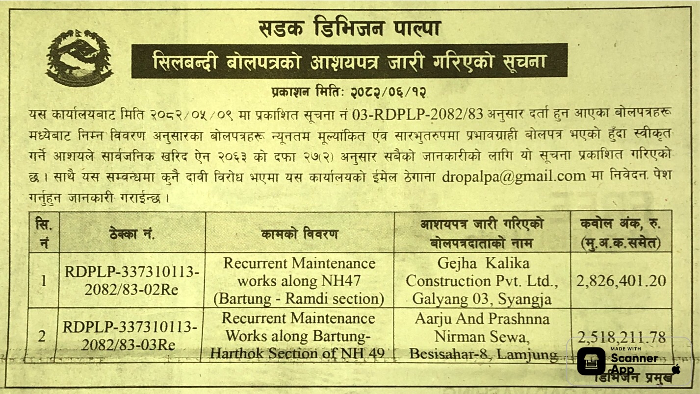 81 Road Division Baglung Periodic Maintenance Works (Resealing) along Midhill Highway (Manewapata- Burtibang Ch. 1036+660 to 1064+050) Section 26/09/2025 PPMO 29/10/2025 Click Here