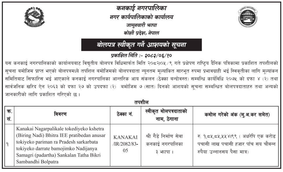 53 Gauriganga Municipality, Chaumala Kailali Collection of sales fees for natural resources (stone, gravel, sand, filling materials, etc.) from Kandra River by Gauriganga Municipality. 26/09/2025 PPMO 12/10/2025 Click Here