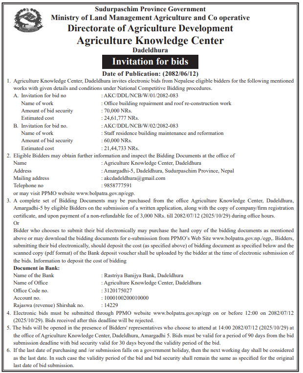 | 18 | Agriculture Knowledge Center, Dadeldhura | Office building repairment and roof re-construction work | 26/09/2025 | PPMO | 29/10/2025 | Click Here | |
