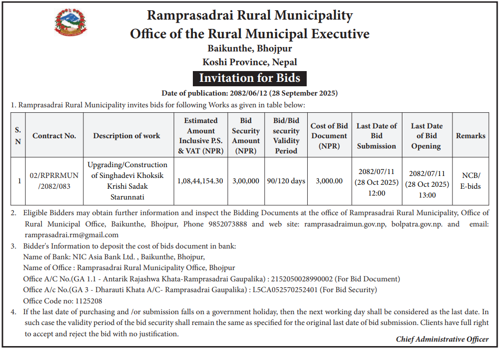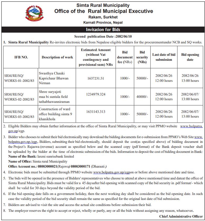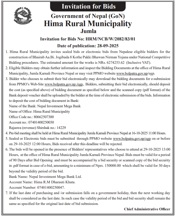 | 27 | Malikarjun Rural Municipality, Darchula | MRM/NCB/01-2082/083 | 26/09/2025 | PPMO | 28/10/2025 | Click Here | |