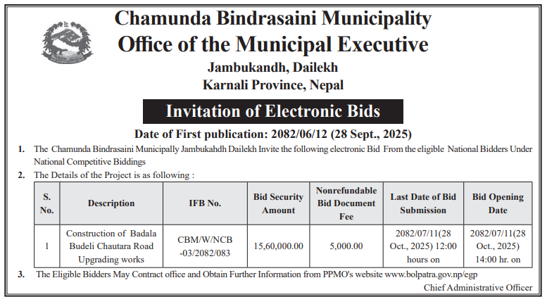 | 304 | Aathabis Municipality, Rakamkarnali Dailekh | Adharbhut Tatha Aakasmik Swasthya Sewa Ko Lgi Aausadhi Kharid. | 26/09/2025 | PPMO | 12/10/2025 | Click Here | |