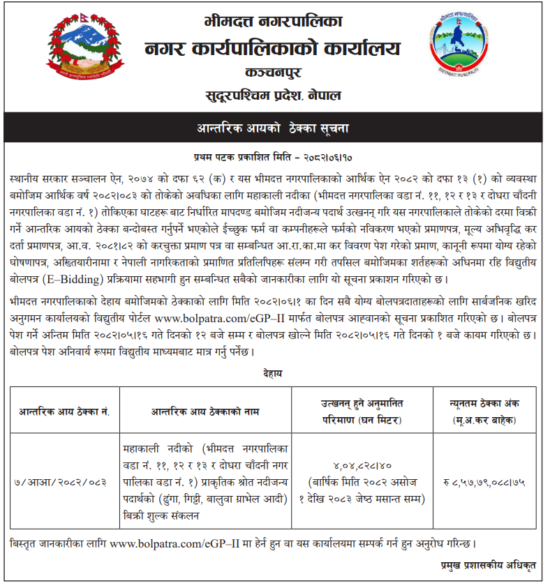 | 52 | Bheemdatt Municipality | Procurement of Royalty Collection from Mahakali River Bed Materials | 26/09/2025 | PPMO | 12/10/2025 | Click Here | |