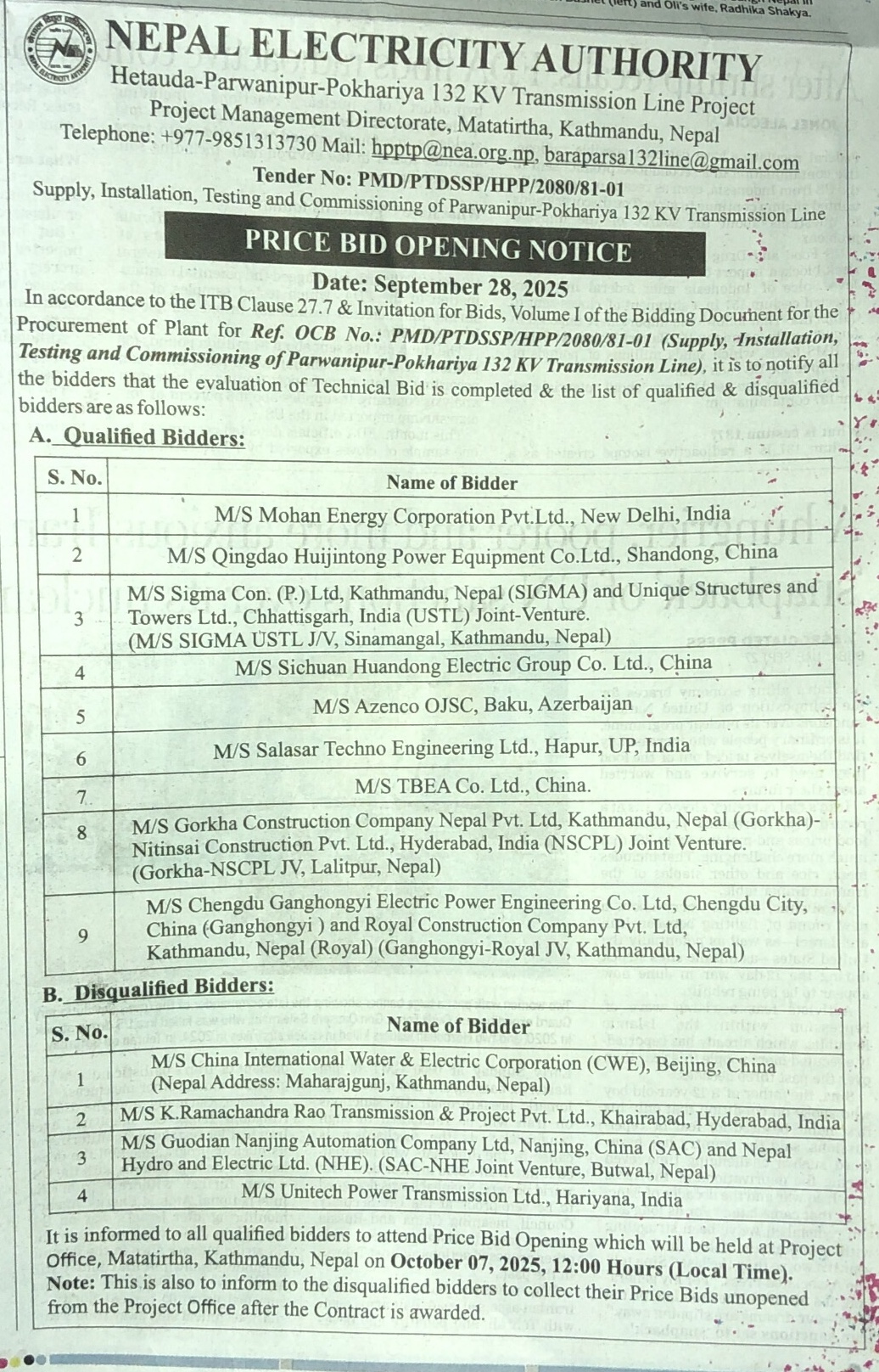 | 283 | Upper Tamakoshi Hydropower Limited | Supply and Delivery of LV ABC Cable at UTKHPP | 26/09/2025 | PPMO | 26/10/2025 | Click Here | |