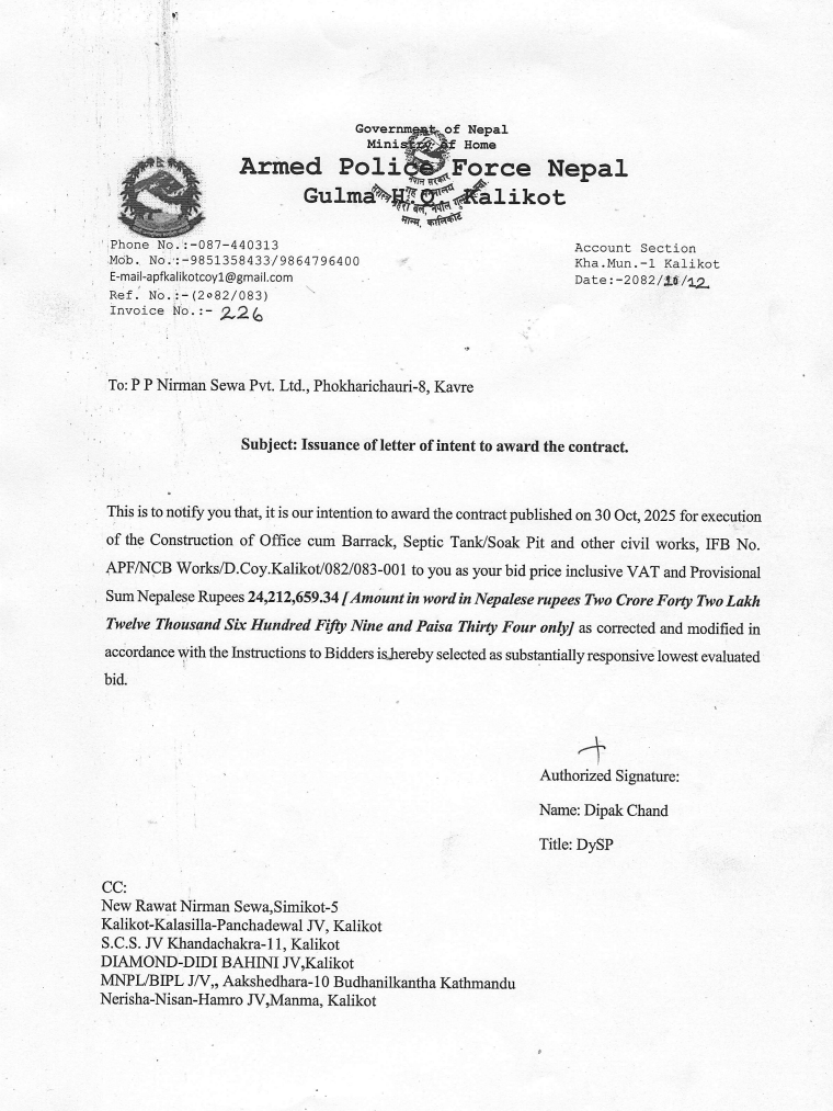 - Award Notice : Road Upgrading Work At Various Places (Swornikita Construction and Suppliers, Gatishil-Gravity JV) |