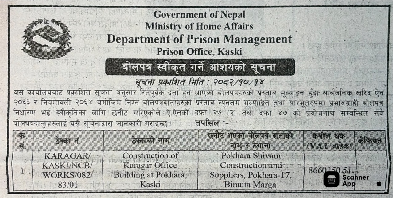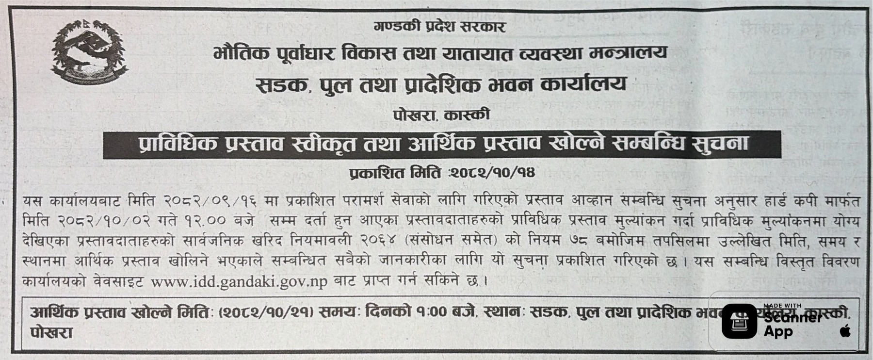 प्रदेश ४ मा प्रकाशित निर्माण सम्बन्धी बोलपत्र तथा आशयका सुचनाहरु