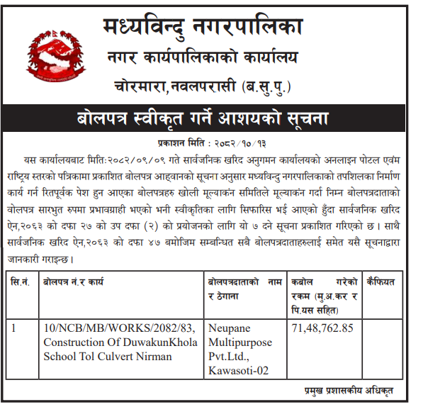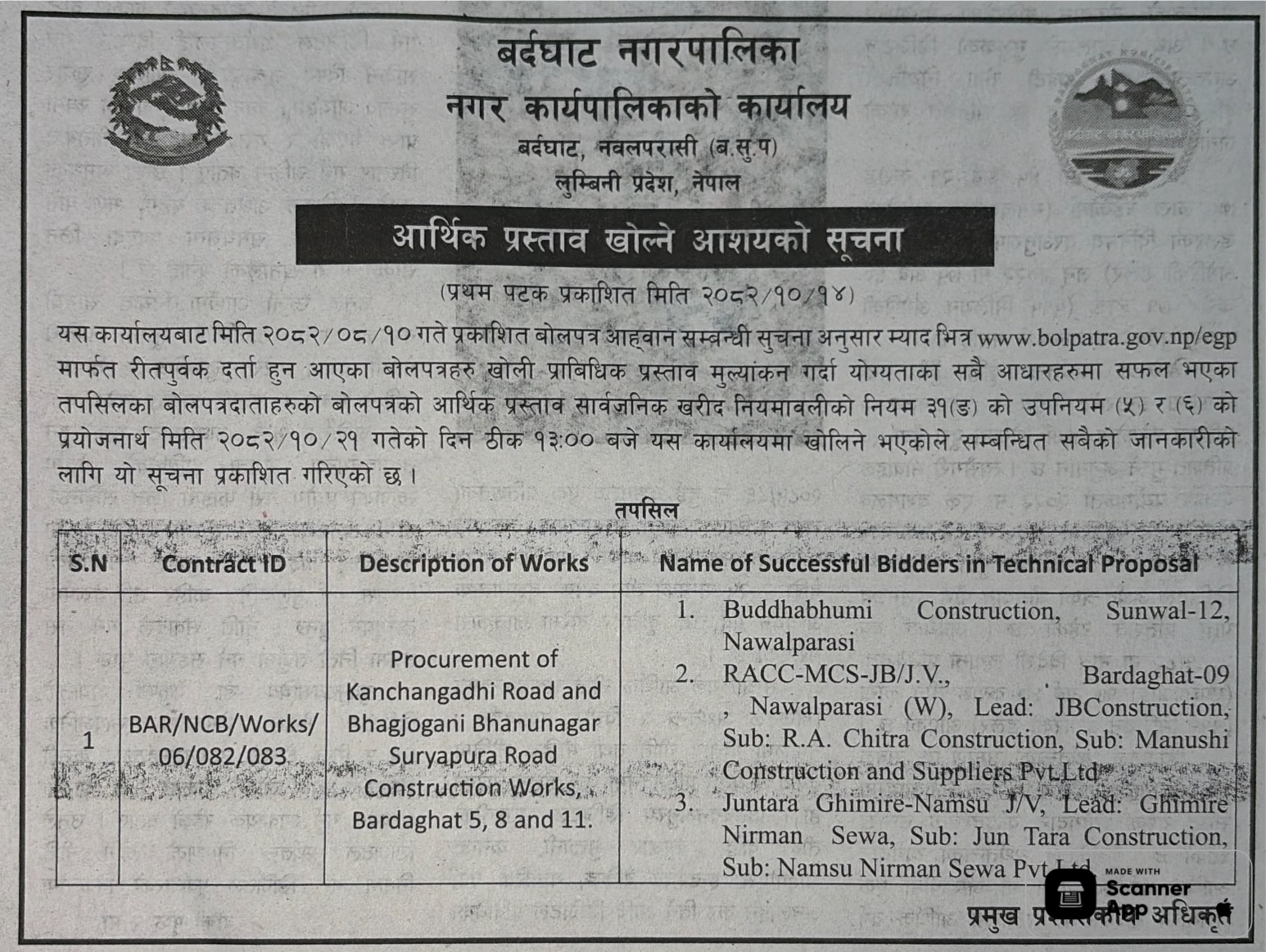 | 201 | Bardaghat Municipality Office, Lumbini Province, NAWALPARASI WEST; | Road Upgradation of Panth tole and Blacktop road work from Adhikari Chowk to Krishi Chowk, Bardaghat-13 | 27/01/2026 | PPMO | 11/02/2026 | Click Here | |