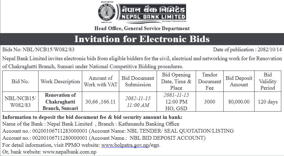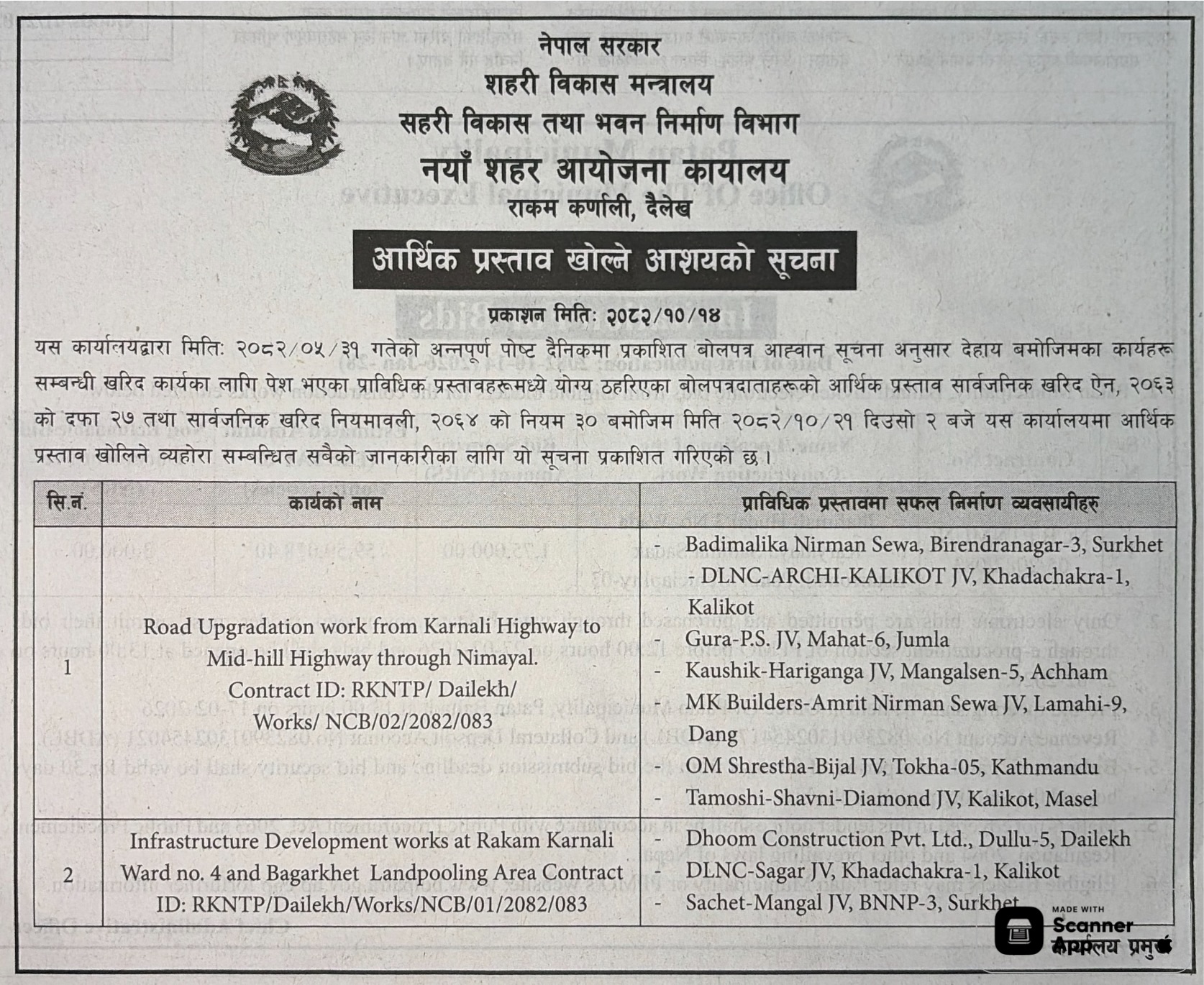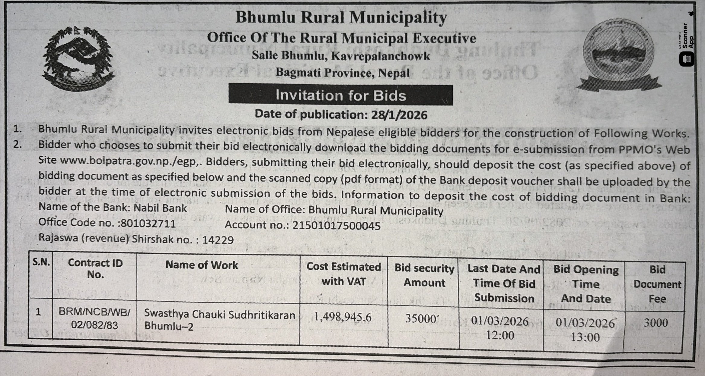 | 180 | Sahari Bikash Tatha bhawan Karyalaya Kavre | Chayabot Tallothali Durlugkhola Sadak , Bethanchok -2 , Kavre | 27/01/2026 | PPMO | 26/02/2026 | Click Here | |