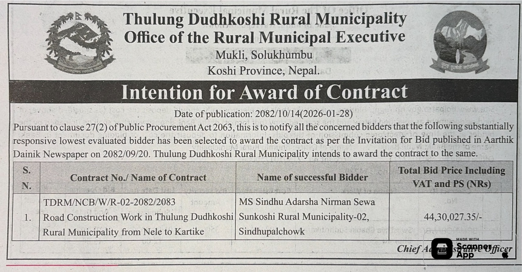 | 229 | Jiri Municipality, Dolakha | Construction of Bhandaar Raate goreto Road | 27/01/2026 | PPMO | 11/02/2026 | Click Here | |