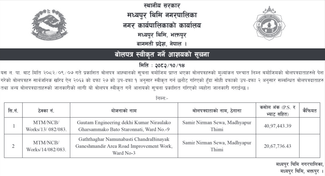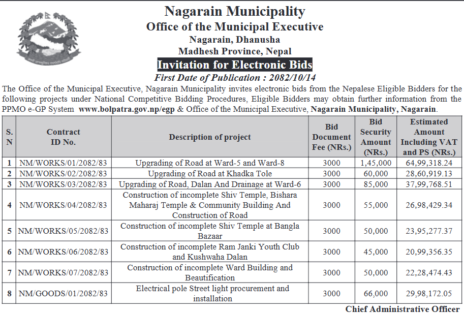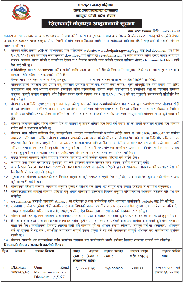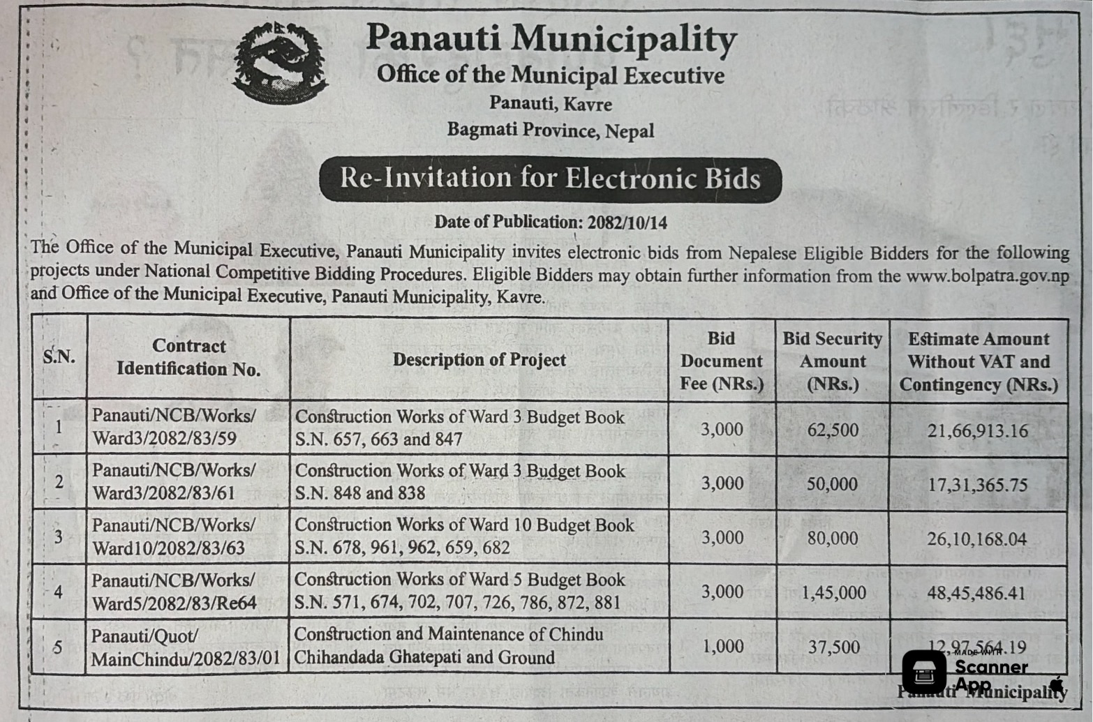 | 7 | Sahari Bikash Tatha bhawan Karyalaya Kavre | Deuralibata Moth Jane Sadak , Panauti-3, Kavre | 27/01/2026 | PPMO | 11/02/2026 | Click Here | |