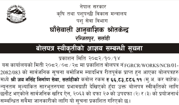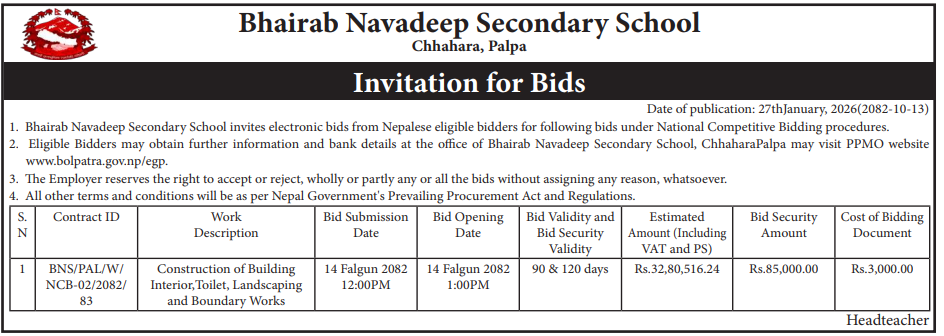 | 11 | Water Resource and Irrigation Development Division Office, Nawalparasi (East of Bardaghat, Susta), Gandaki Province | Construction of Pump Unit, Pump House and Electrification Work of Kudauli Deep Tubewell Sichai Pranali,Kawasoti-11, Nawalparasi (Ba.Su.Pu.) | 27/01/2026 | PPMO | 11/02/2026 | Click Here | |