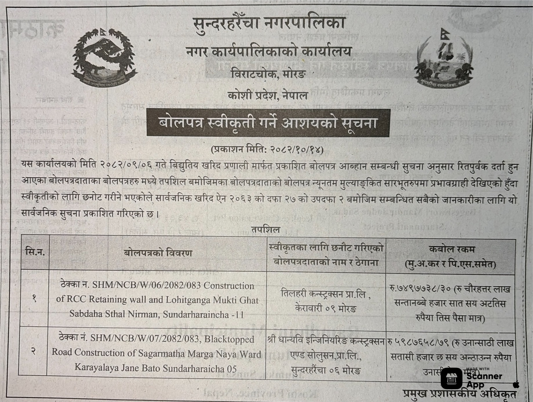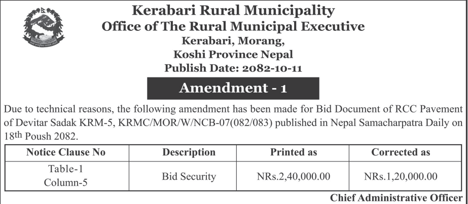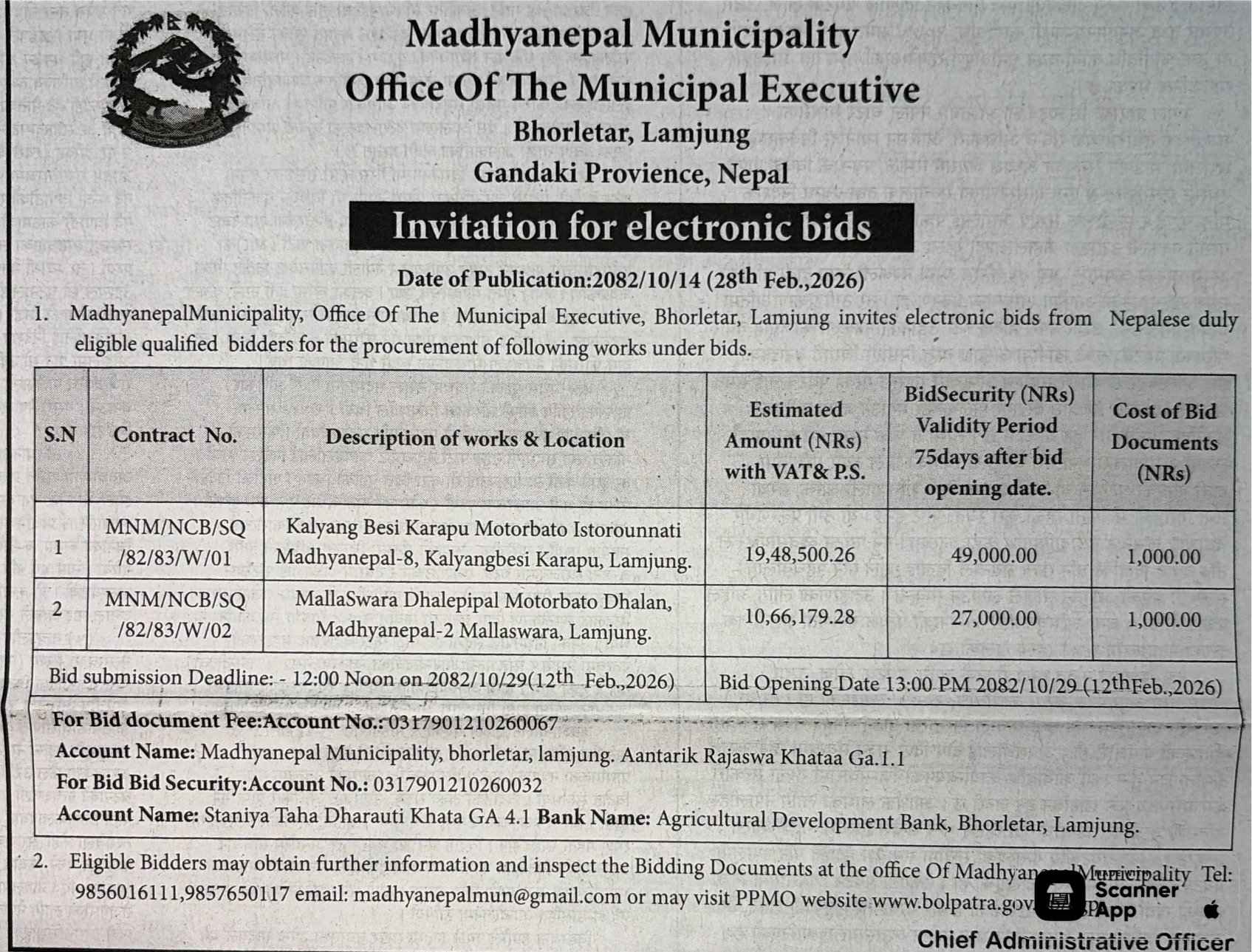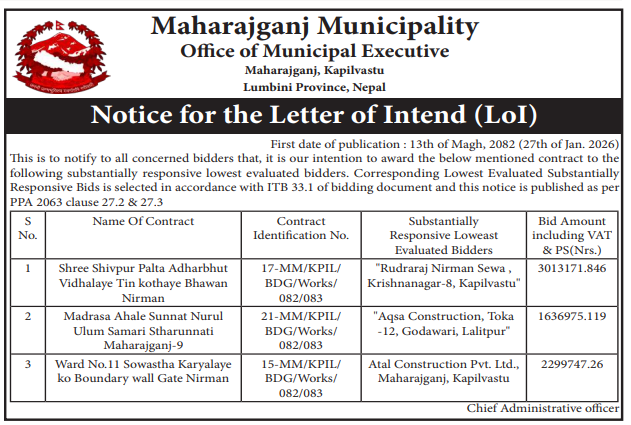 | 195 | Buddhabhumi Municipality Office, Kapilbastu | Madhunagar Dakshin saw mill dekhi uttar jane sadak , jhusiya Shivsankar Kewat ko ghar dekhi paschim jungle jane sadak, Charigawa Ramkesh Tiwariko ghar dekhi ramnaryan Paschim kulo, | 27/01/2026 | PPMO | 11/02/2026 | Click Here | |