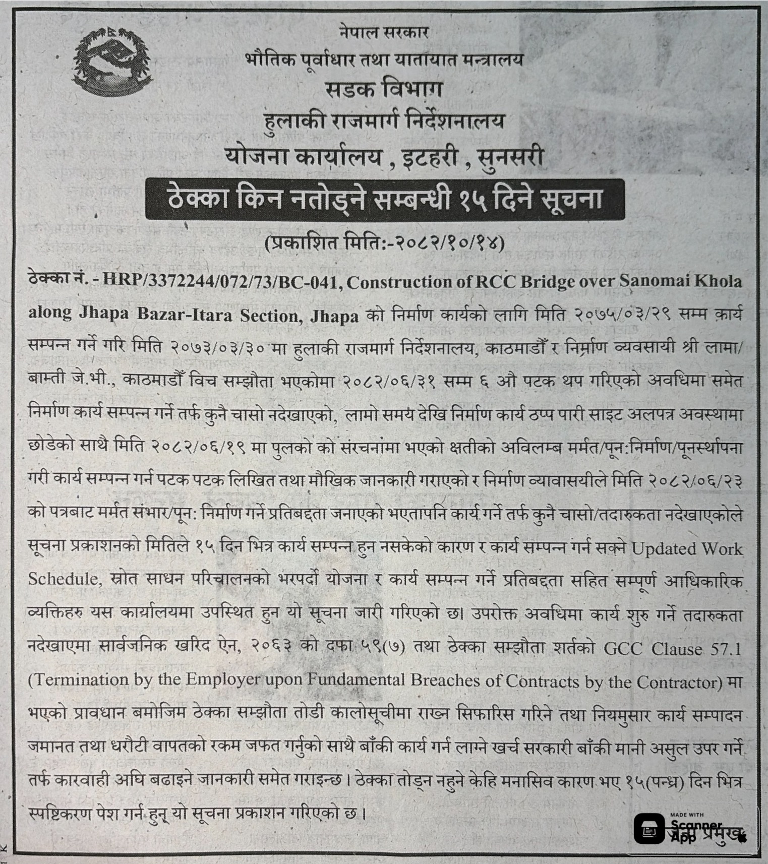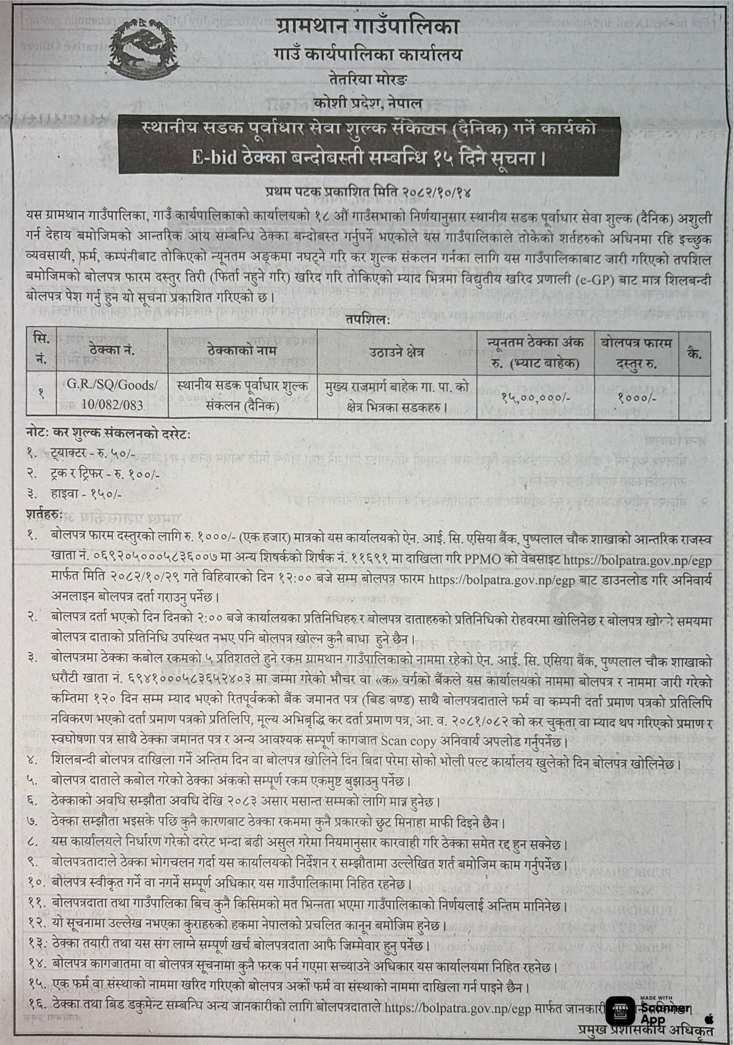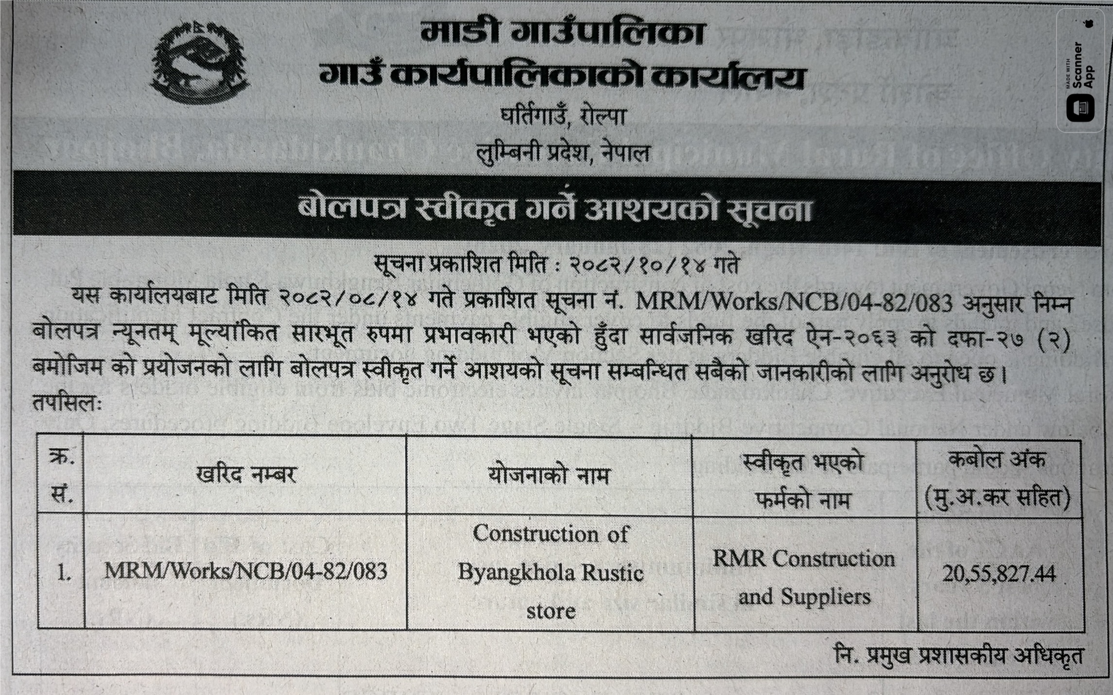 | 195 | Buddhabhumi Municipality Office, Kapilbastu | Madhunagar Dakshin saw mill dekhi uttar jane sadak , jhusiya Shivsankar Kewat ko ghar dekhi paschim jungle jane sadak, Charigawa Ramkesh Tiwariko ghar dekhi ramnaryan Paschim kulo, | 27/01/2026 | PPMO | 11/02/2026 | Click Here | |