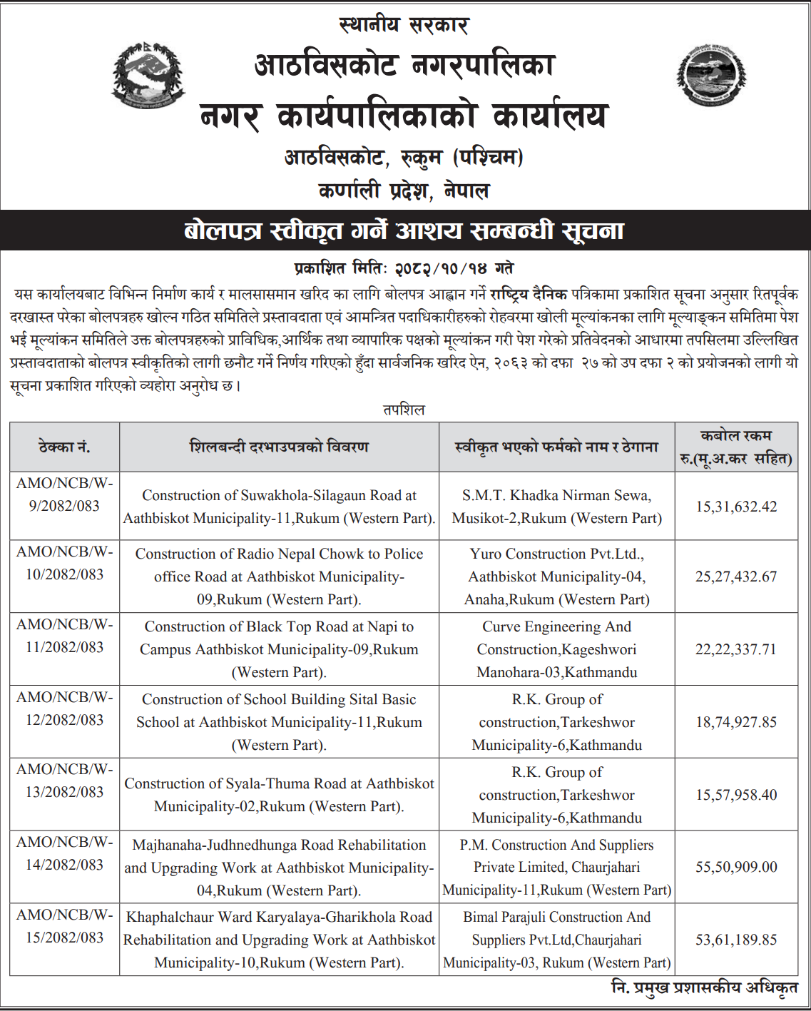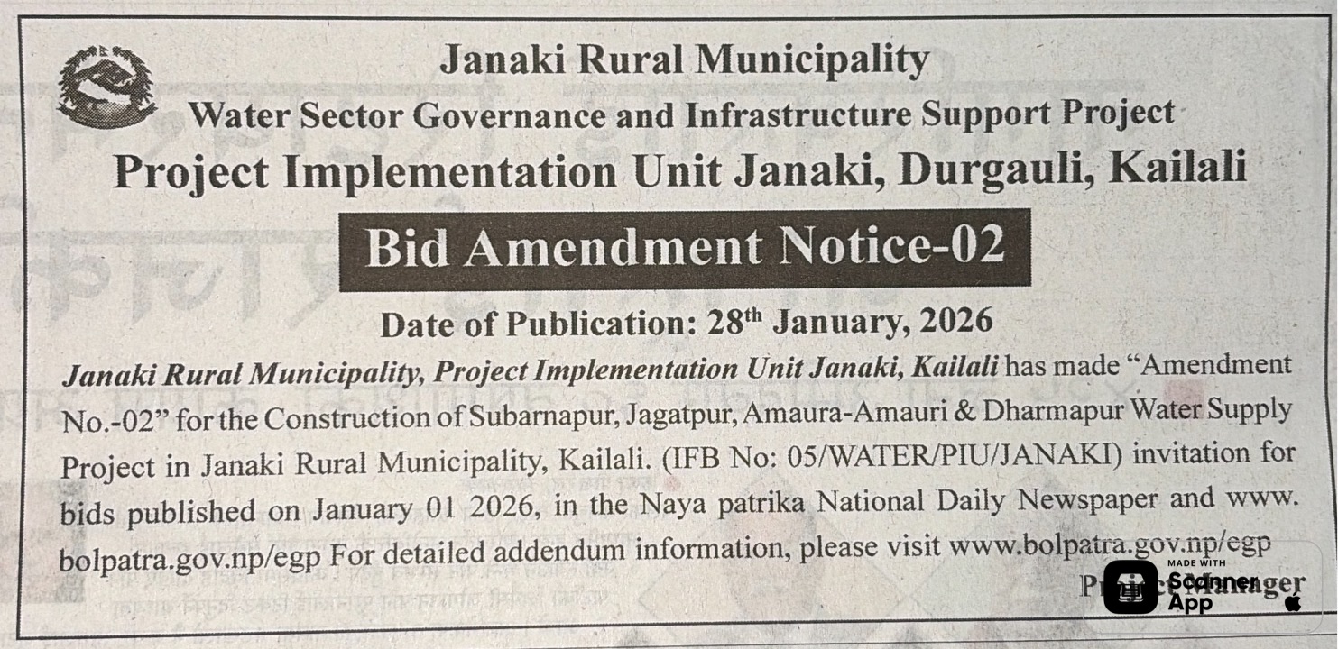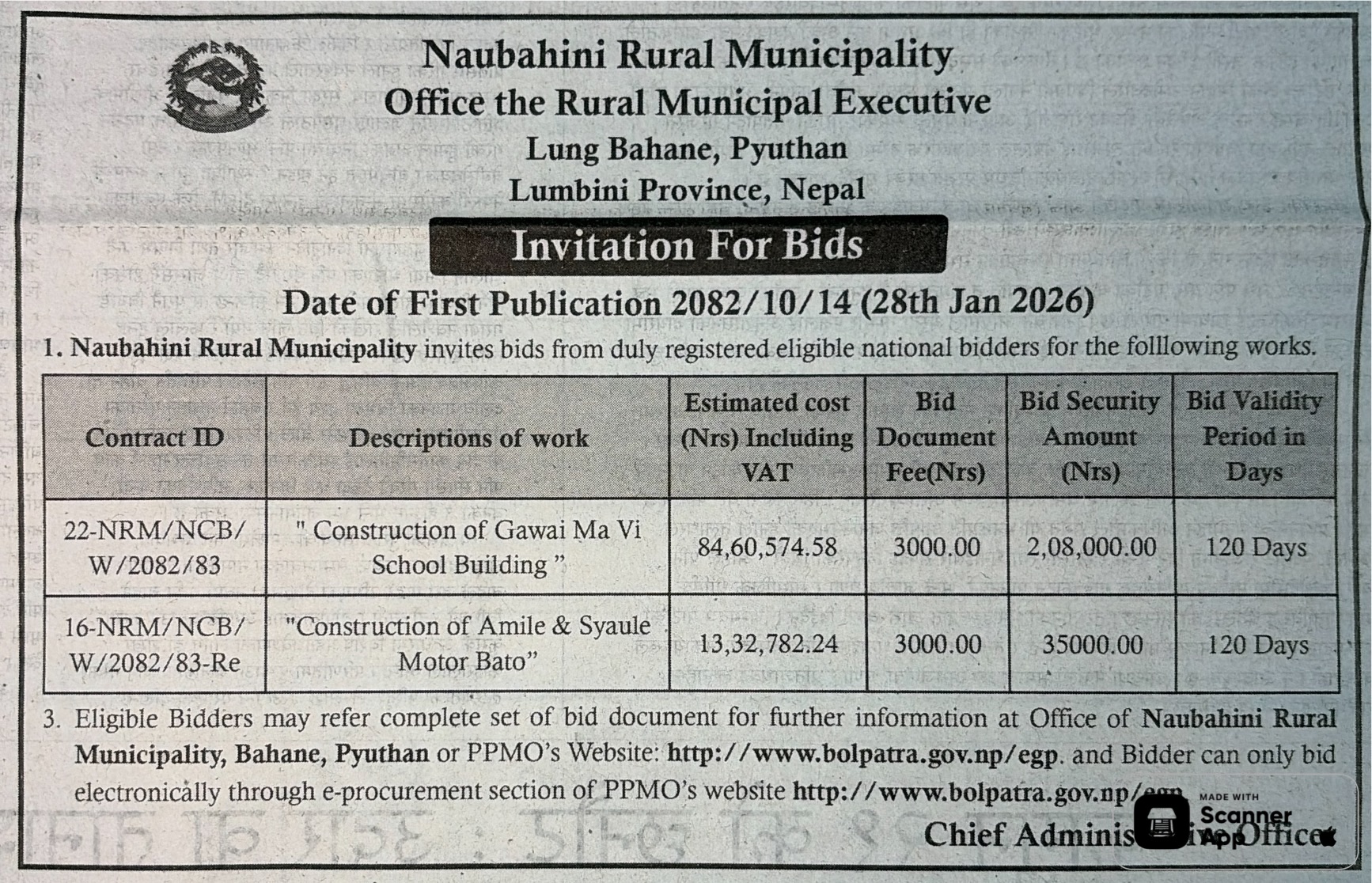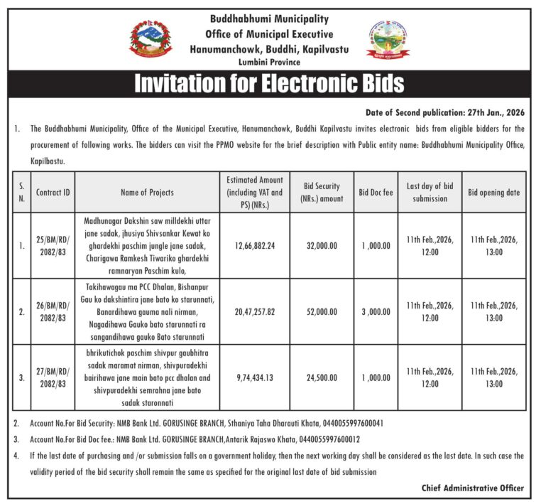 | 196 | Buddhabhumi Municipality Office, Kapilbastu | Takihawa gau ma PCC Dhalan, Bishanpur Gau ko dakshin tira jane bato ko starunnati, Banardihawa gauma nali nirman, Nagadihawa Gauko bato starunnati ra sangandihawa gauko Bato starunnati | 27/01/2026 | PPMO | 11/02/2026 | Click Here | |
