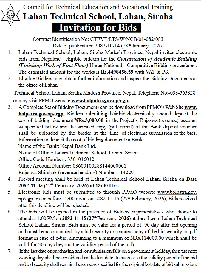 | 171 | Shree Secondary School, Kumharaul Ramdaiya Bhawadi, Dhanusha | Construction of two storey building with eight rooms | 27/01/2026 | PPMO | 26/02/2026 | Click Here | |