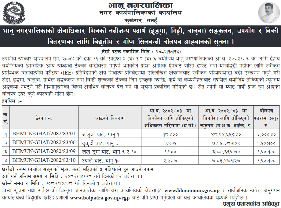 | 206 | Badigad Rural Municipality, Baglung | Riverbed materials extraction work from Badigad Khola at Sisneri Bagar ,dhaireghat bagar & eklekhet Bagar ( Badigad ward no.6) | 27/01/2026 | PPMO | 11/02/2026 | Click Here | |