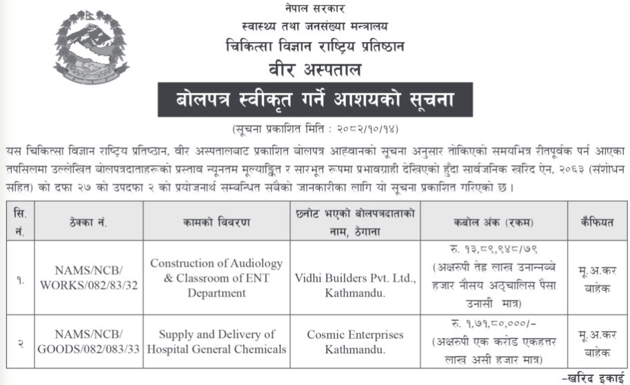 | 34 | Tribhuvan University Teaching Hospital (TUTH) | Procurement of Fully Automated Microbiology, Virology & Immunology Analyzer Tests | 27/01/2026 | PPMO | 26/02/2026 | Click Here | |