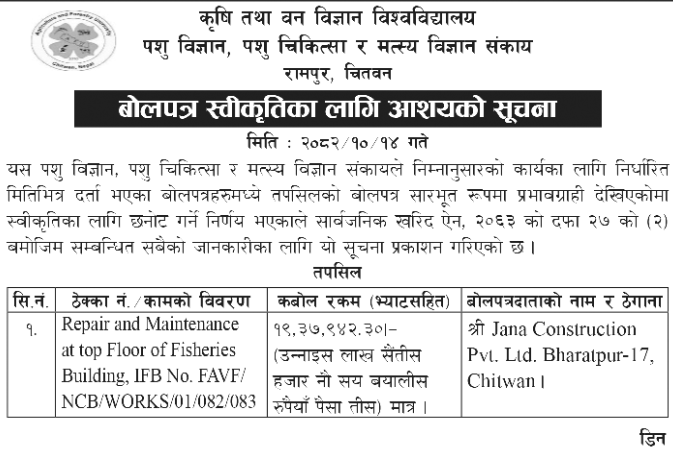 | 44 | Bakaiya Rural Municipality, Makawanpur | Procurement and Supply of Essential Medicine for livestock. | 27/01/2026 | PPMO | 11/02/2026 | Click Here | |