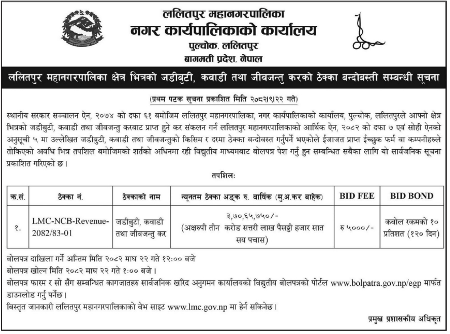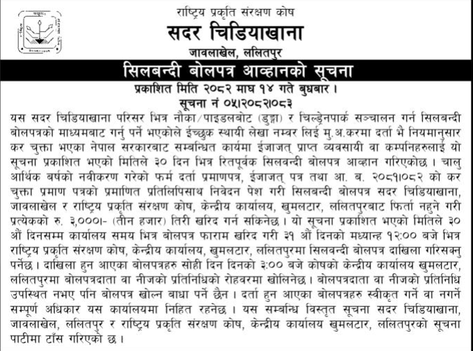 | 20 | Kathmandu Metropolitan City Office | Procurement of Management Service for Community Dead Animal | 27/01/2026 | PPMO | 27/02/2026 | Click Here | |