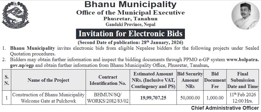 | 189 | Office of The Phaktanglung Rural Municipality | Construction of Ghunsa entrance gate/ Infrastructure (Porter's accommodation) to promote tourism in Kanchanjungha conservation area | 27/01/2026 | PPMO | 25/02/2026 | Click Here | |