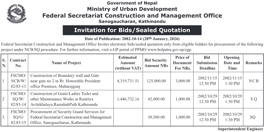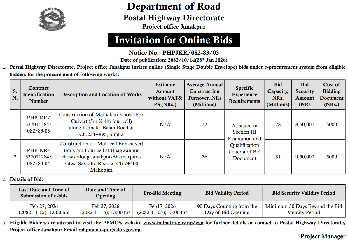 | 163 | Department of Water Resources and Irrigation, Lalitpur | Pakhabari Tole Landslide Protection Works, Suryabinayak Na.Pa.-5, Bhaktapur | 27/01/2026 | PPMO | 26/02/2026 | Click Here | |
