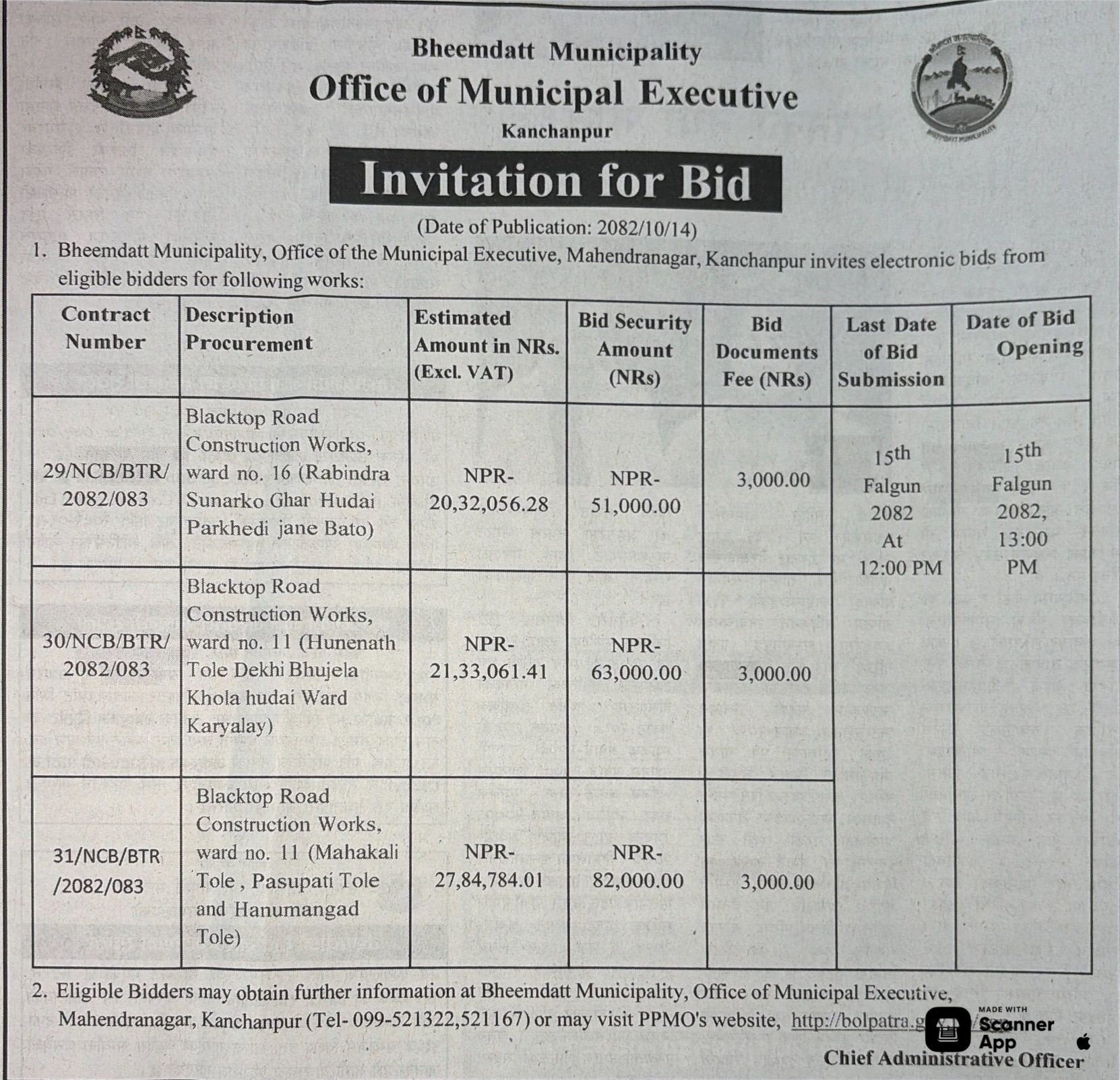 | 199 | Bheemdatt Municipality | Blacktop Road Construction Works, Ward no. 11 (Hunenath tole Narayan Saud ko Ghar Tarf) | 27/01/2026 | PPMO | 11/02/2026 | Click Here | |