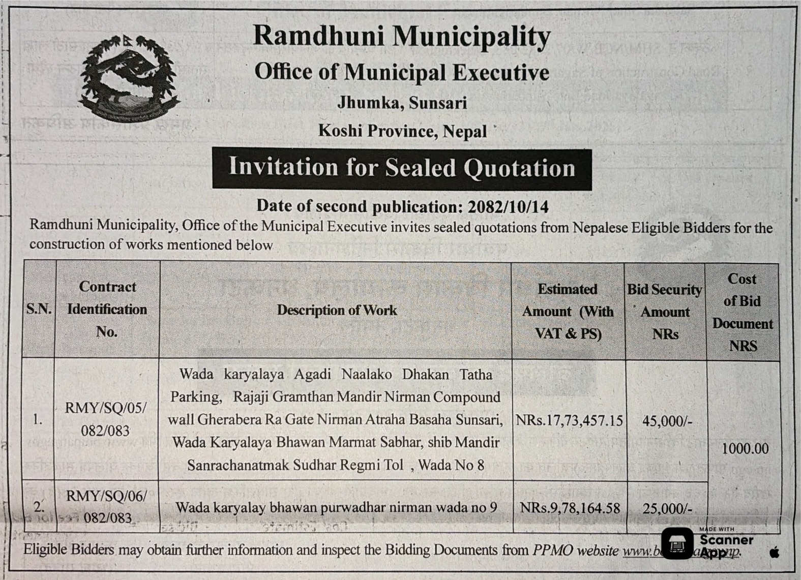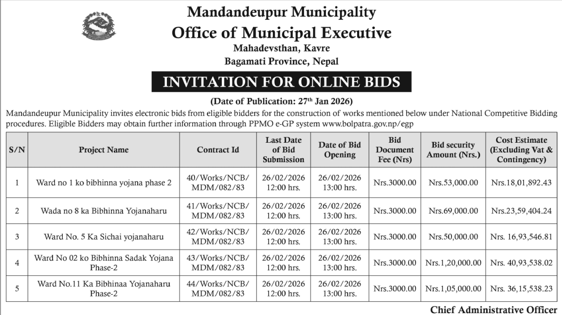 | 6 | Sahari Bikash Tatha bhawan Karyalaya Kavre | Khorang Kaseri Bhanjyang Sadak , Bahrbise – 5 , Sindhupalchok | 27/01/2026 | PPMO | 11/02/2026 | Click Here | |