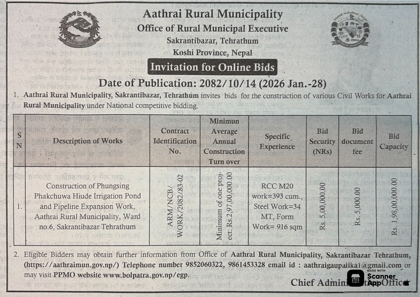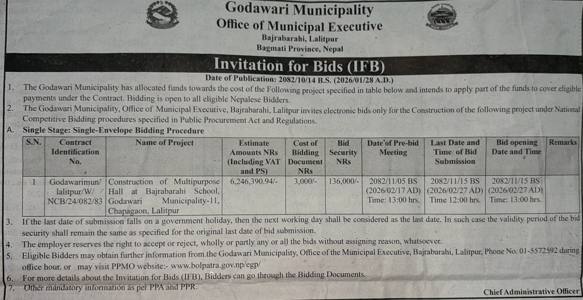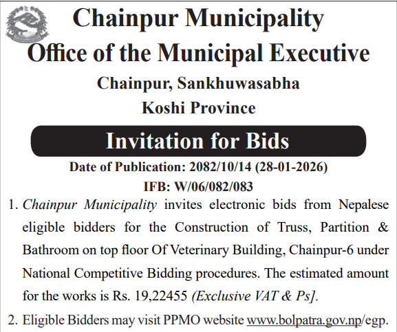 | 190 | Champadevi Rural Municipality Office, Koshi Province, OKHALDHUNGA; | CDRM/okh/NCB/Works/07/2082/083 Construction of Gyan Prakash Ma vi Ghorakhori building class Block 3-c-9 | 27/01/2026 | PPMO | 12/02/2026 | Click Here | |