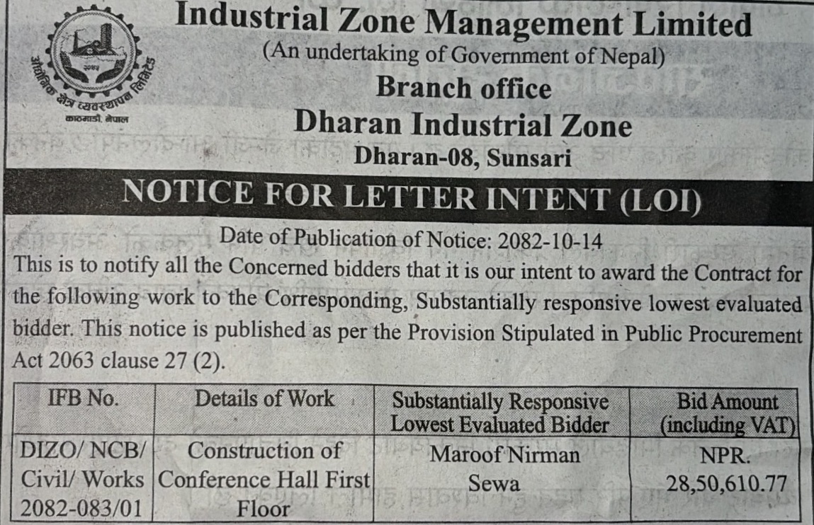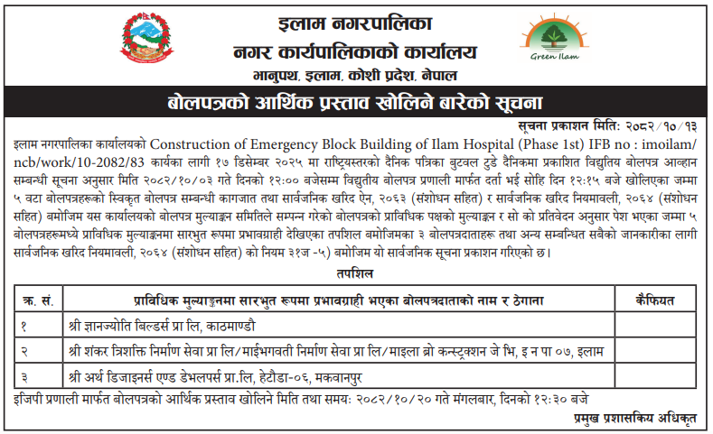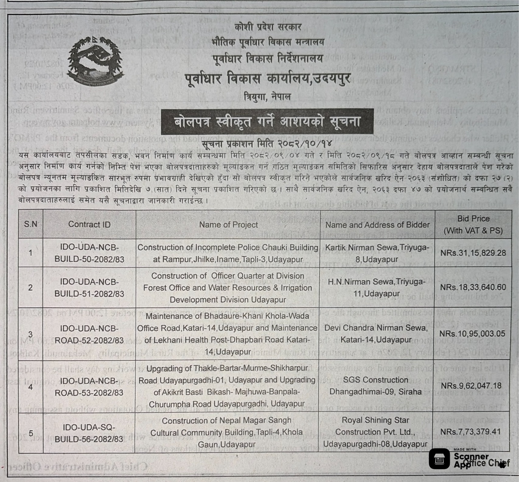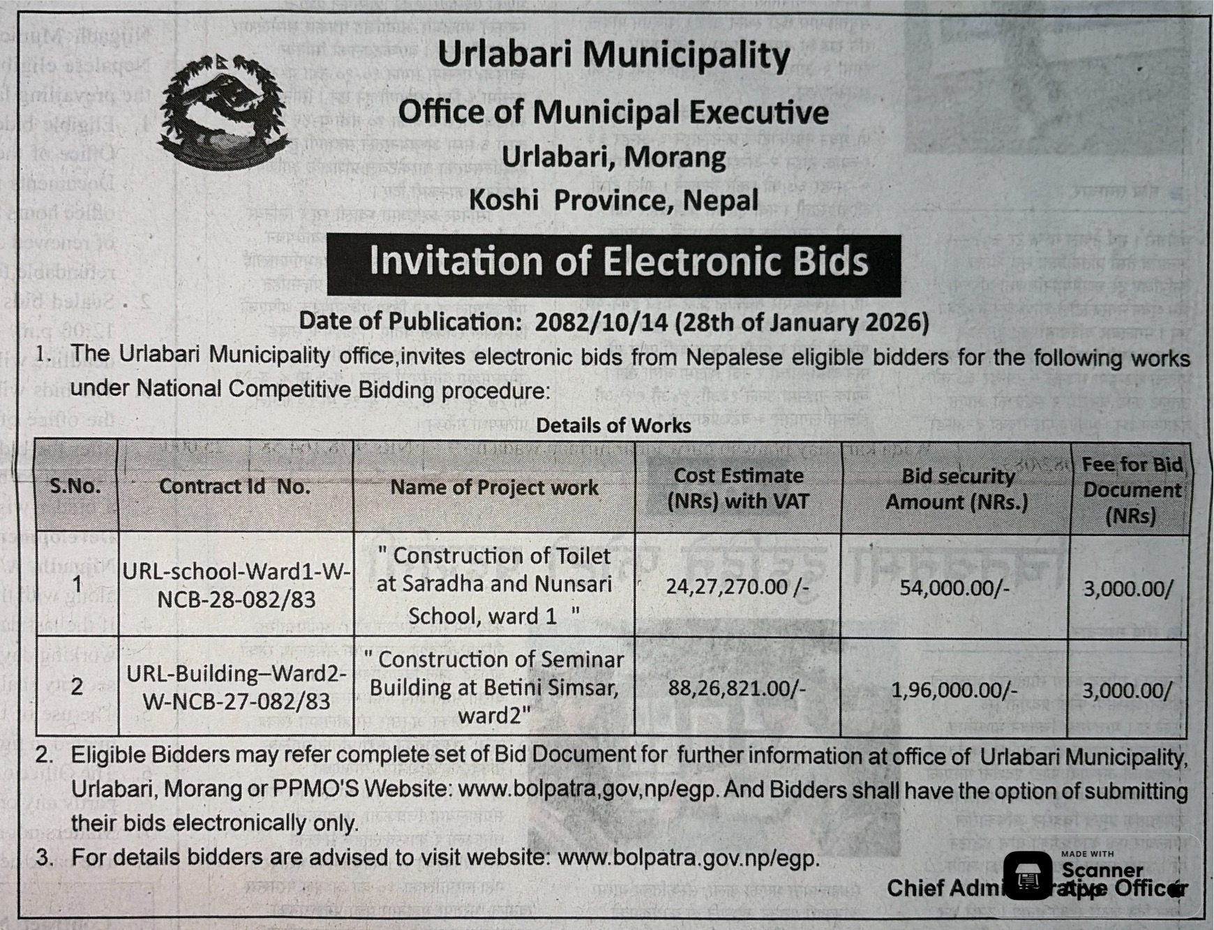 | 190 | Champadevi Rural Municipality Office, Koshi Province, OKHALDHUNGA; | CDRM/okh/NCB/Works/07/2082/083 Construction of Gyan Prakash Ma vi Ghorakhori building class Block 3-c-9 | 27/01/2026 | PPMO | 12/02/2026 | Click Here | |