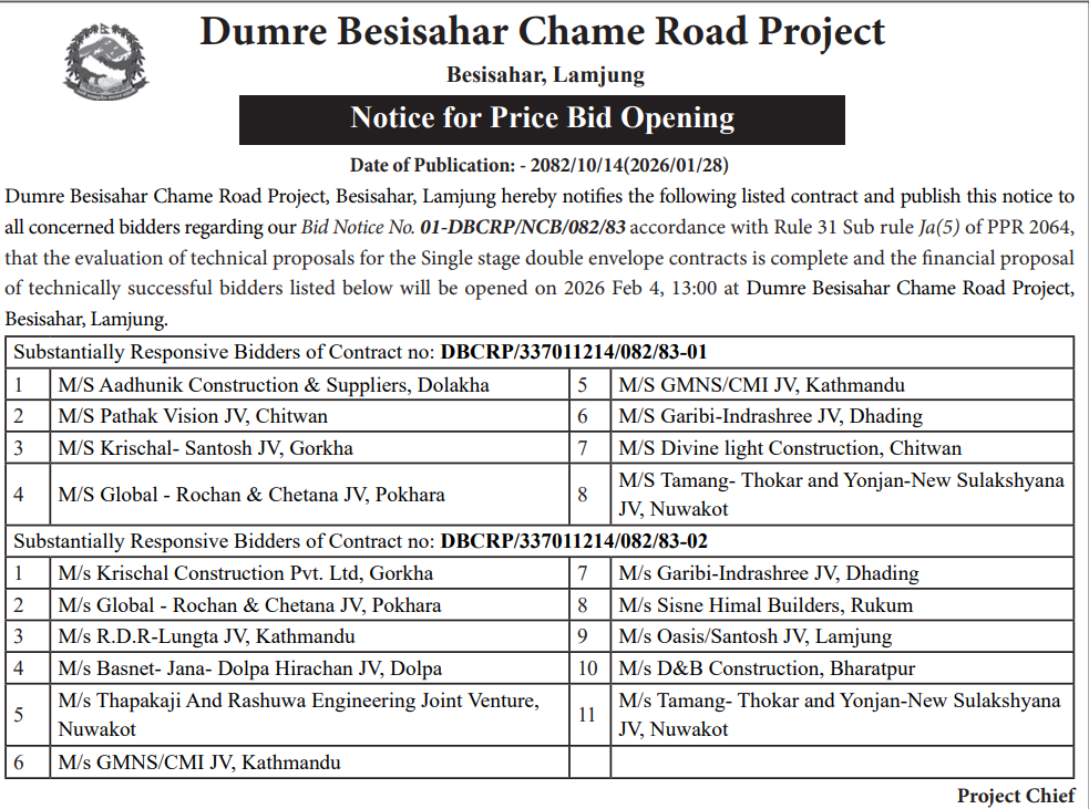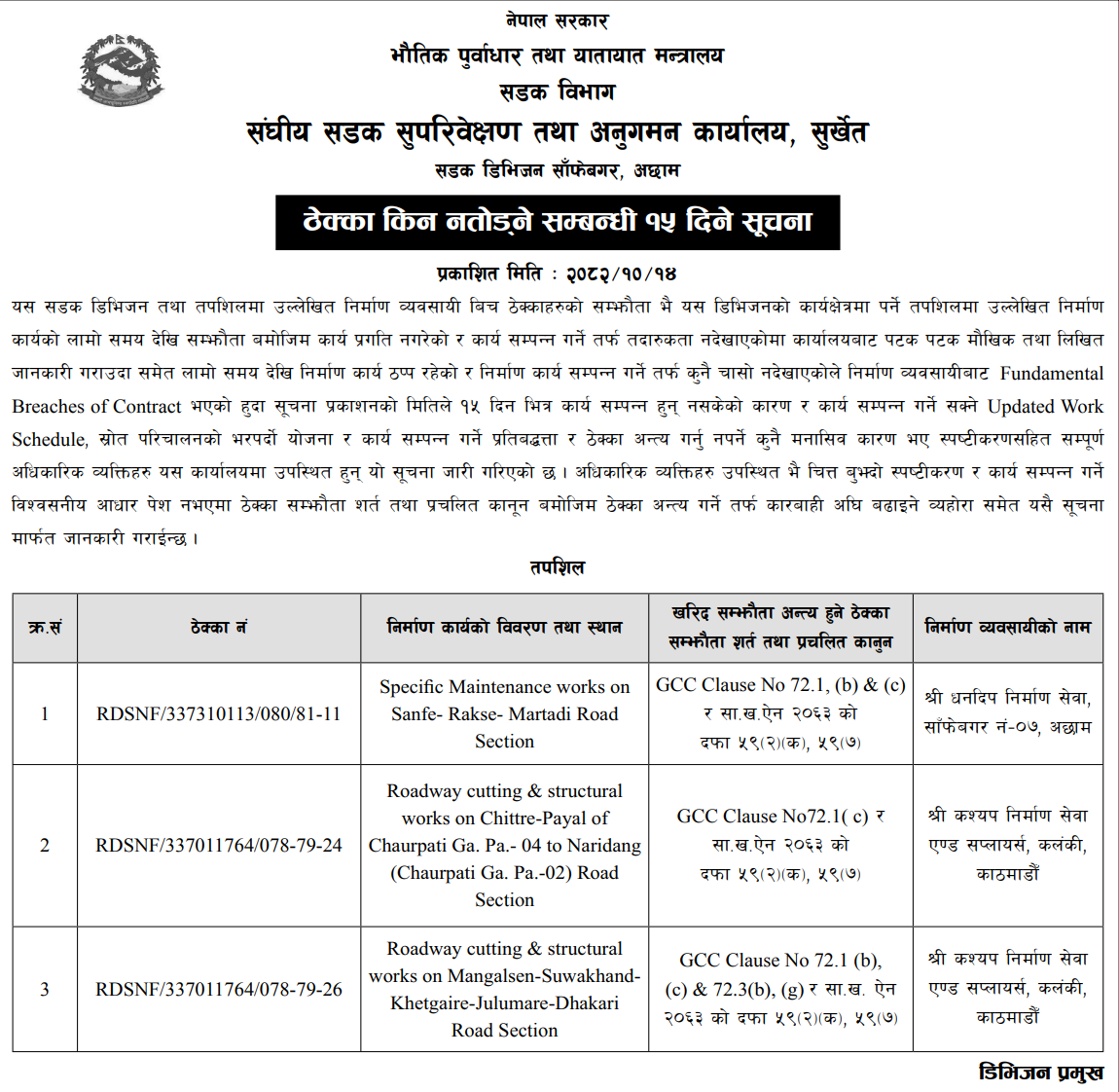 | 174 | Road Division, Surkhet | Recurrent (Reactive) Maintenance works Along Surkhet-Jumla Road (Ch. 114+000 - 119+200 of NH-58), Dailekh District; RDSKT/33731011-3/082/83-23 | 27/01/2026 | PPMO | 26/02/2026 | Click Here | |