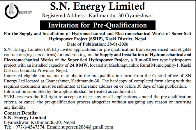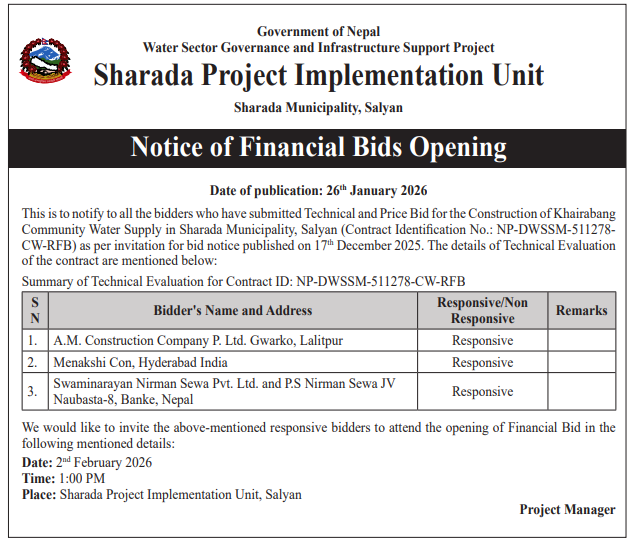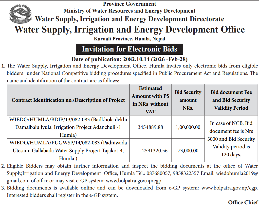 | 186 | Water Supply and Sanitation Division Office, Pyuthan | Electrification Works(Supply and Installation of HT/LT Line) in Bartan Lift WSP,Sworgdwari M-03, Pyuthan | 27/01/2026 | PPMO | 26/02/2026 | Click Here | |