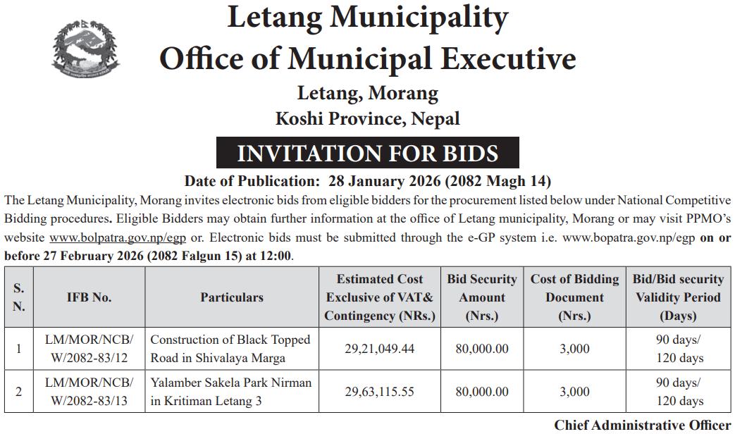 | 239 | Bharatpur Metropolitian City Office, Bagmati Province, CHITWAN; | Construction of Blacktopped Road at DeutiTole Ghumti Marga, BMC-02 | 27/01/2026 | PPMO | 11/02/2026 | Click Here | |