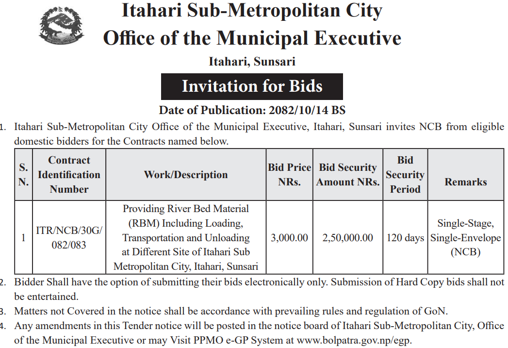 | 32 | Hetauda Sub-Metropolitan City | Procurement, Supply and Delivery of Stationery And Other Miscellaneous Goods | 27/01/2026 | PPMO | 26/02/2026 | Click Here | |