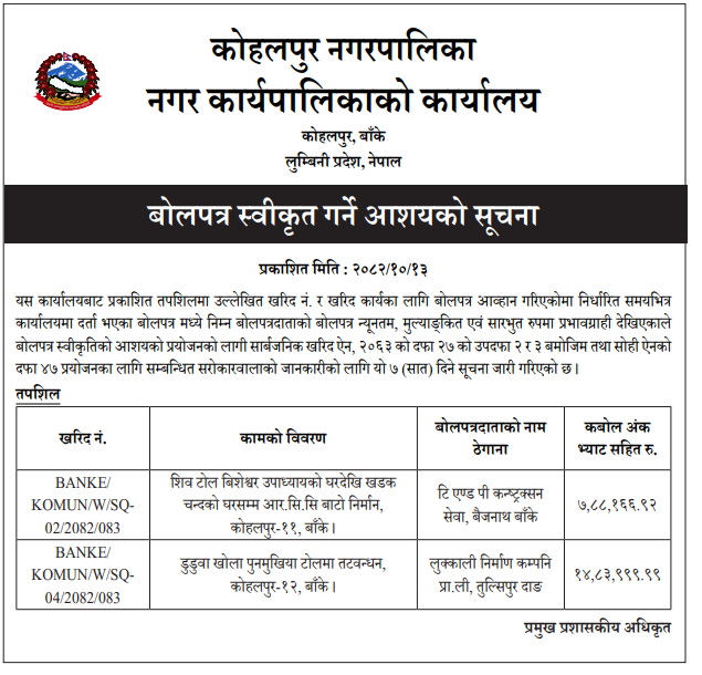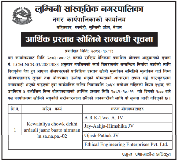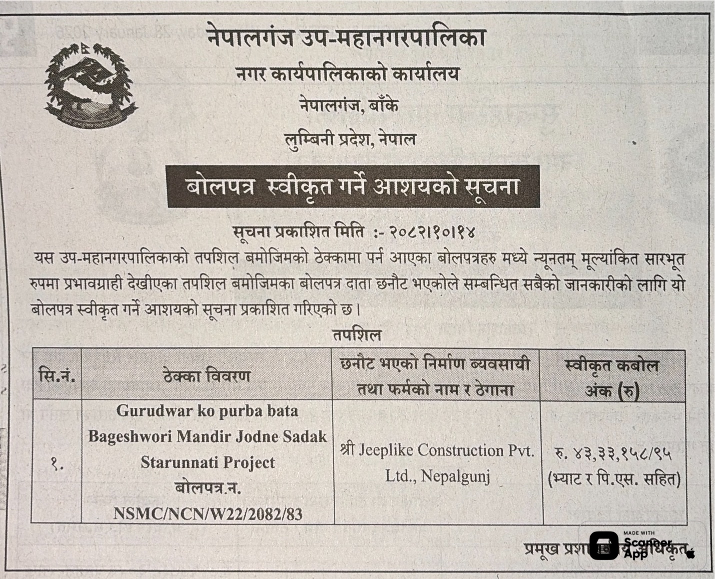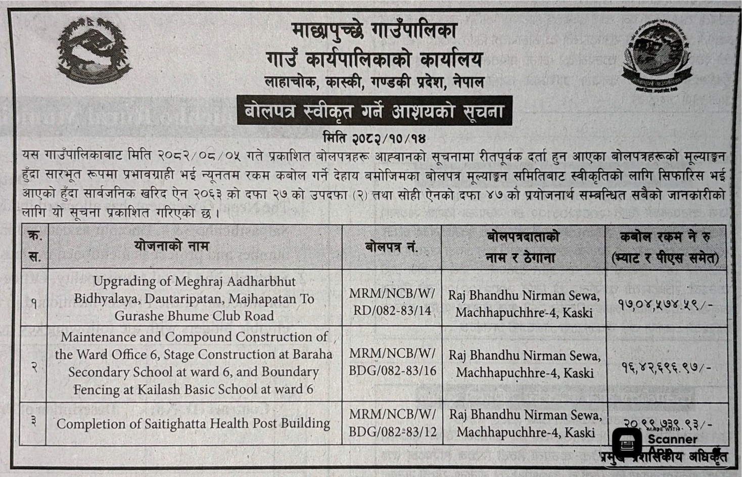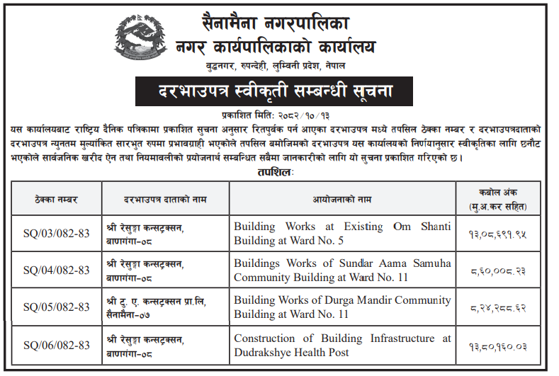 | 197 | Buddhabhumi Municipality Office, Kapilbastu | bhrikuti chok paschim shivpur gaubhitra sadak maramat nirman,shivpuradekhi bairihawa jane main bato pcc dhalan and shivpuradekhi semrahna jane bato sadak staronnati | 27/01/2026 | PPMO | 11/02/2026 | Click Here | |